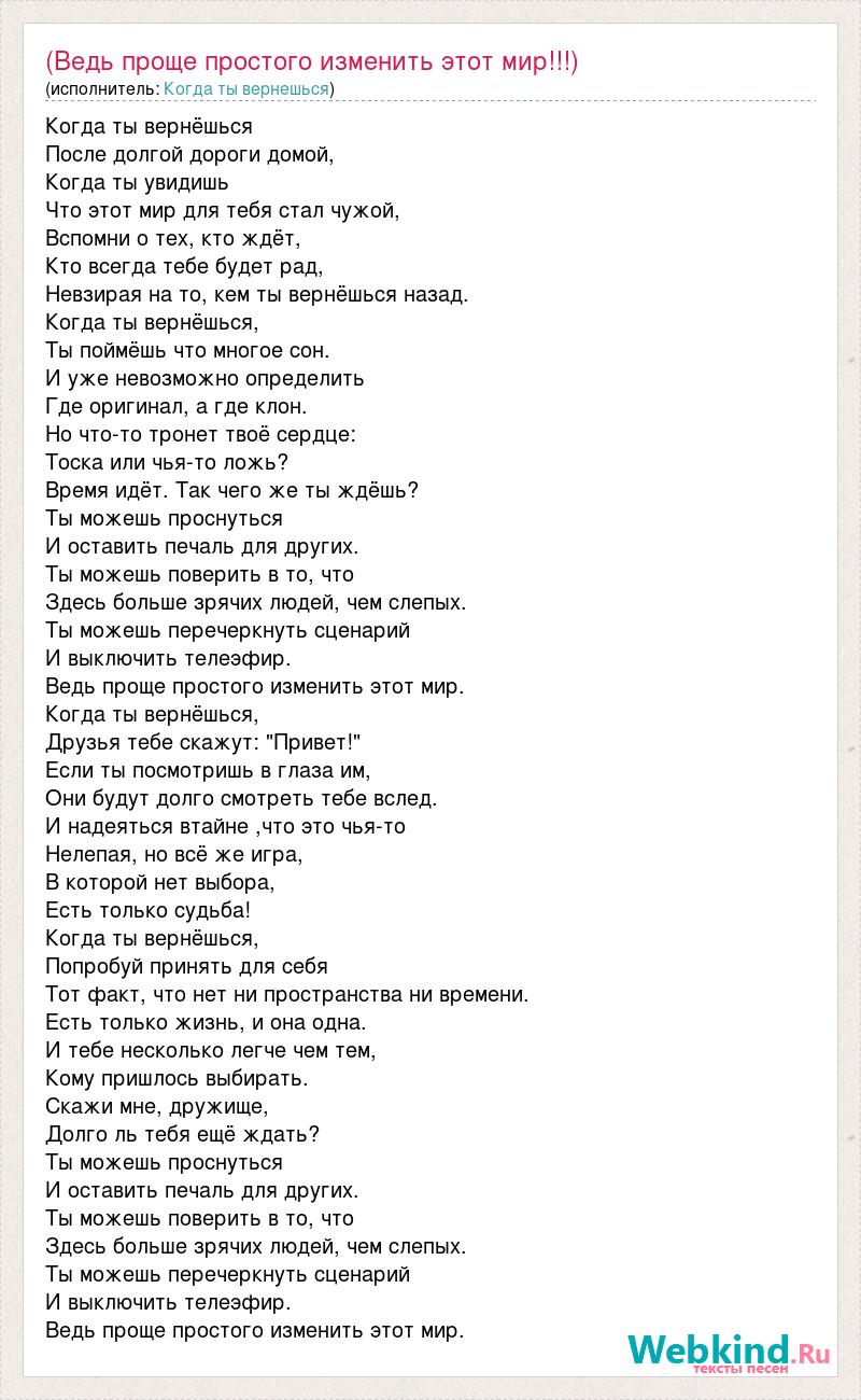 Когда ты вернёшься После долгой дороги домой, Когда ты увидишь Что этот мир для тебя стал чужой, Вспомни о тех, кто ждёт, Кто всегда тебе будет рад, Невзирая на то, кем ты вернёшься назад. Когда ты вернёшься, Ты поймёшь что многое сон. И уже невозможно определить Где оригинал, а где клон. Но что-то тронет твоё сердце: Тоска или чья-то ложь? Время идёт. Так чего же ты ждёшь? Ты можешь проснуться И оставить печаль для других. Ты можешь поверить в то, что Здесь больше зрячих людей, чем слепых. Ты можешь перечеркнуть сценарий И выключить телеэфир. Ведь проще простого изменить этот мир. Когда ты вернёшься, Друзья тебе скажут: "Привет!" Если ты посмотришь в глаза им, Они будут долго смотреть тебе вслед. И надеяться втайне ,что это чья-то Нелепая, но всё же игра, В которой нет выбора, Есть только судьба! Когда ты вернёшься, Попробуй принять для себя Тот факт, что нет ни пространства ни времени. Есть только жизнь, и она одна. И тебе несколько легче чем тем, Кому пришлось выбирать. Скажи мне, дружище, Долго ль тебя ещё ждать? Ты можешь проснуться И оставить печаль для других. Ты можешь поверить в то, что Здесь больше зрячих людей, чем слепых. Ты можешь перечеркнуть сценарий И выключить телеэфир. Ведь проще простого изменить этот мир.
