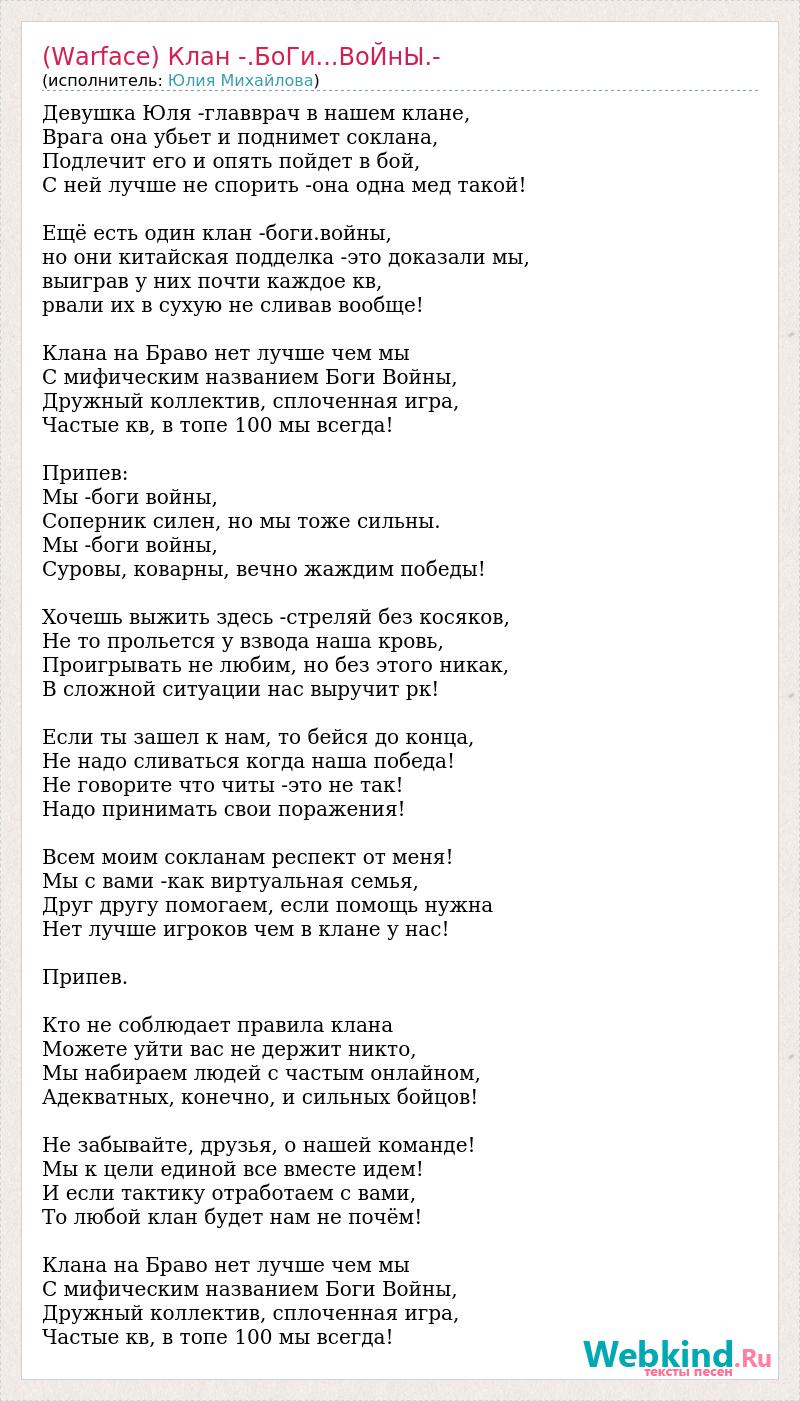 Девушка Юля -главврач в нашем клане, Врага она убьет и поднимет соклана, Подлечит его и опять пойдет в бой, С ней лучше не спорить -она одна мед такой! Ещё есть один клан -боги.войны, но они китайская подделка -это доказали мы, выиграв у них почти каждое кв, рвали их в сухую не сливав вообще! Клана на Браво нет лучше чем мы С мифическим названием Боги Войны, Дружный коллектив, сплоченная игра, Частые кв, в топе 100 мы всегда! Припев: Мы -боги войны, Соперник силен, но мы тоже сильны. Мы -боги войны, Суровы, коварны, вечно жаждим победы! Хочешь выжить здесь -стреляй без косяков, Не то прольется у взвода наша кровь, Проигрывать не любим, но без этого никак, В сложной ситуации нас выручит рк! Если ты зашел к нам, то бейся до конца, Не надо сливаться когда наша победа! Не говорите что читы -это не так! Надо принимать свои поражения! Всем моим сокланам респект от меня! Мы с вами -как виртуальная семья, Друг другу помогаем, если помощь нужна Нет лучше игроков чем в клане у нас! Припев. Кто не соблюдает правила клана Можете уйти вас не держит никто, Мы набираем людей с частым онлайном, Адекватных, конечно, и сильных бойцов! Не забывайте, друзья, о нашей команде! Мы к цели единой все вместе идем! И если тактику отработаем с вами, То любой клан будет нам не почём! Клана на Браво нет лучше чем мы С мифическим названием Боги Войны, Дружный коллектив, сплоченная игра, Частые кв, в топе 100 мы всегда!