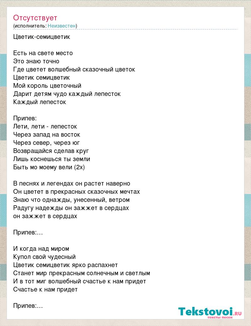 Цветик-семицветик Есть на свете место Это знаю точно Где цветет волшебный сказочный цветок Цветик семицветик Мой король цветочный Дарит детям чудо каждый лепесток Каждый лепесток Припев: Лети, лети - лепесток Через запад на восток Через север, через юг Возвращайся сделав круг Лишь коснешься ты земли Быть мо моему вели (2х) В песнях и легендах он растет наверно Он цветет в прекрасных сказочных мечтах Знаю что однажды, унесенный, ветром Радугу надежды он зажжет в сердцах он зажжет в сердцах Припев:… И когда над миром Купол свой чудесный Цветик семицветик ярко распахнет Станет мир прекрасным солнечным и светлым И в тот миг волшебный счастье к нам придет Счастье к нам придет Припев:…