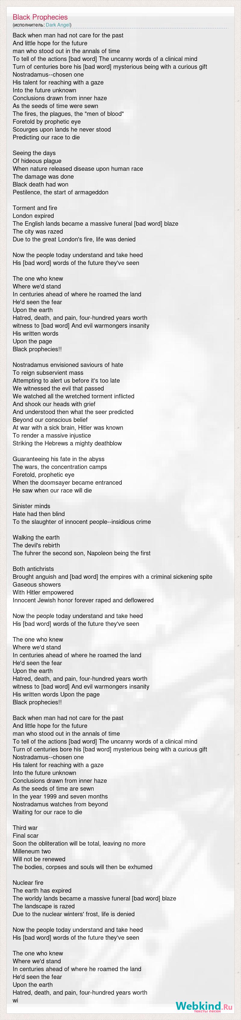 Back when man had not care for the past And little hope for the future man who stood out in the annals of time To tell of the actions [bad word] The uncanny words of a clinical mind Turn of centuries bore his [bad word] mysterious being with a curious gift Nostradamus--chosen one His talent for reaching with a gaze Into the future unknown Conclusions drawn from inner haze As the seeds of time were sewn The fires, the plagues, the "men of blood" Foretold by prophetic eye Scourges upon lands he never stood Predicting our race to die Seeing the days Of hideous plague When nature released disease upon human race The damage was done Black death had won Pestilence, the start of armageddon Torment and fire London expired The English lands became a massive funeral [bad word] blaze The city was razed Due to the great London's fire, life was denied Now the people today understand and take heed His [bad word] words of the future they've seen The one who knew Where we'd stand In centuries ahead of where he roamed the land He'd seen the fear Upon the earth Hatred, death, and pain, four-hundred years worth witness to [bad word] And evil warmongers insanity His written words Upon the page Black prophecies!! Nostradamus envisioned saviours of hate To reign subservient mass Attempting to alert us before it's too late We witnessed the evil that passed We watched all the wretched torment inflicted And shook our heads with grief And understood then what the seer predicted Beyond our conscious belief At war with a sick brain, Hitler was known To render a massive injustice Striking the Hebrews a mighty deathblow Guaranteeing his fate in the abyss The wars, the concentration camps Foretold, prophetic eye When the doomsayer became entranced He saw when our race will die Sinister minds Hate had then blind To the slaughter of innocent people--insidious crime Walking the earth The devil's rebirth The fuhrer the second son, Napoleon being the first Both antichrists Brought anguish and [bad word] the empires with a criminal sickening spite Gaseous showers With Hitler empowered Innocent Jewish honor forever raped and deflowered Now the people today understand and take heed His [bad word] words of the future they've seen The one who knew Where we'd stand In centuries ahead of where he roamed the land He'd seen the fear Upon the earth Hatred, death, and pain, four-hundred years worth witness to [bad word] And evil warmongers insanity His written words Upon the page Black prophecies!! Back when man had not care for the past And little hope for the future man who stood out in the annals of time To tell of the actions [bad word] The uncanny words of a clinical mind Turn of centuries bore his [bad word] mysterious being with a curious gift Nostradamus--chosen one His talent for reaching with a gaze Into the future unknown Conclusions drawn from inner haze As the seeds of time are sewn In the year 1999 and seven months Nostradamus watches from beyond Waiting for our race to die Third war Final scar Soon the obliteration will be total, leaving no more Milleneum two Will not be renewed The bodies, corpses and souls will then be exhumed Nuclear fire The earth has expired The worldy lands became a massive funeral [bad word] blaze The landscape is razed Due to the nuclear winters' frost, life is denied Now the people today understand and take heed His [bad word] words of the future they've seen The one who knew Where we'd stand In centuries ahead of where he roamed the land He'd seen the fear Upon the earth Hatred, death, and pain, four-hundred years worth wi