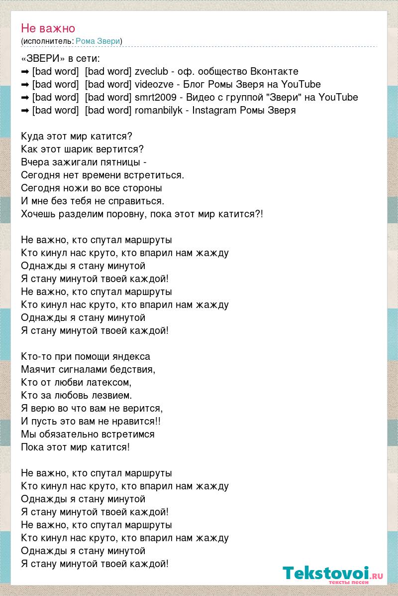 «ЗВЕРИ» в сети: ➡ [bad word] [bad word] zveclub - оф. ообщество Вконтакте ➡ [bad word] [bad word] videozve - Блог Ромы Зверя на YouTube ➡ [bad word] [bad word] smrt2009 - Видео с группой "Звери" на YouTube ➡ [bad word] [bad word] romanbilyk - Instagram Ромы Зверя Куда этот мир катится? Как этот шарик вертится? Вчера зажигали пятницы - Сегодня нет времени встретиться. Сегодня ножи во все стороны И мне без тебя не справиться. Хочешь разделим поровну, пока этот мир катится?! Не важно, кто спутал маршруты Кто кинул нас круто, кто впарил нам жажду Однажды я стану минутой Я стану минутой твоей каждой! Не важно, кто спутал маршруты Кто кинул нас круто, кто впарил нам жажду Однажды я стану минутой Я стану минутой твоей каждой! Кто-то при помощи яндекса Маячит сигналами бедствия, Кто от любви латексом, Кто за любовь лезвием. Я верю во что вам не верится, И пусть это вам не нравится!! Мы обязательно встретимся Пока этот мир катится! Не важно, кто спутал маршруты Кто кинул нас круто, кто впарил нам жажду Однажды я стану минутой Я стану минутой твоей каждой! Не важно, кто спутал маршруты Кто кинул нас круто, кто впарил нам жажду Однажды я стану минутой Я стану минутой твоей каждой!
