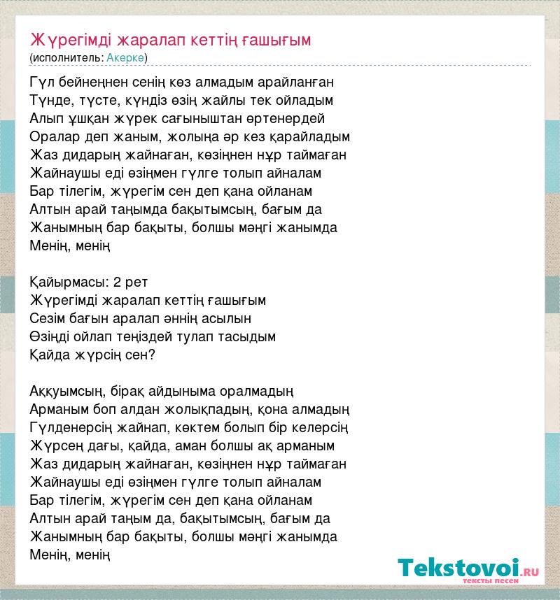 Гүл бейнеңнен сенің көз алмадым арайланған Түнде, түсте, күндіз өзің жайлы тек ойладым Алып ұшқан жүрек сағыныштан өртенердей Оралар деп жаным, жолыңа әр кез қарайладым Жаз дидарың жайнаған, көзіңнен нұр таймаған Жайнаушы еді өзіңмен гүлге толып айналам Бар тілегім, жүрегім сен деп қана ойланам Алтын арай таңымда бақытымсың, бағым да Жанымның бар бақыты, болшы мәңгі жанымда Менің, менің Қайырмасы: 2 рет Жүрегімді жаралап кеттің ғашығым Сезім бағын аралап әннің асылын Өзіңді ойлап теңіздей тулап тасыдым Қайда жүрсің сен? Аққуымсың, бірақ айдыныма оралмадың Арманым боп алдан жолықпадың, қона алмадың Гүлденерсің жайнап, көктем болып бір келерсің Жүрсең дағы, қайда, аман болшы ақ арманым Жаз дидарың жайнаған, көзіңнен нұр таймаған Жайнаушы еді өзіңмен гүлге толып айналам Бар тілегім, жүрегім сен деп қана ойланам Алтын арай таңым да, бақытымсың, бағым да Жанымның бар бақыты, болшы мәңгі жанымда Менің, менің