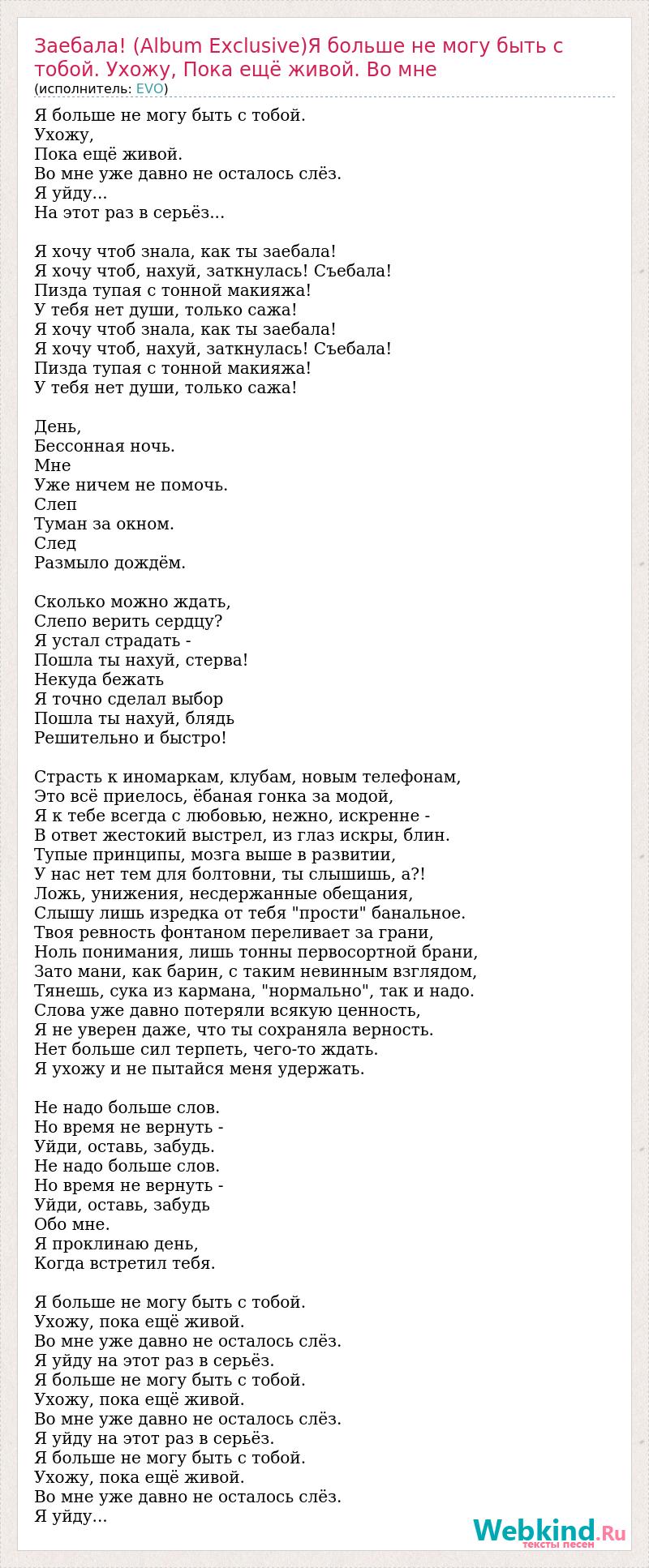 Я больше не могу быть с тобой. Ухожу, Пока ещё живой. Во мне уже давно не осталось слёз. Я уйду... На этот раз в серьёз... Я хочу чтоб знала, как ты заебала! Я хочу чтоб, нахуй, заткнулась! Съебала! Пизда тупая с тонной макияжа! У тебя нет души, только сажа! Я хочу чтоб знала, как ты заебала! Я хочу чтоб, нахуй, заткнулась! Съебала! Пизда тупая с тонной макияжа! У тебя нет души, только сажа! День, Бессонная ночь. Мне Уже ничем не помочь. Слеп Туман за окном. След Размыло дождём. Сколько можно ждать, Слепо верить сердцу? Я устал страдать - Пошла ты нахуй, стерва! Некуда бежать Я точно сделал выбор Пошла ты нахуй, блядь Решительно и быстро! Страсть к иномаркам, клубам, новым телефонам, Это всё приелось, ёбаная гонка за модой, Я к тебе всегда с любовью, нежно, искренне - В ответ жестокий выстрел, из глаз искры, блин. Тупые принципы, мозга выше в развитии, У нас нет тем для болтовни, ты слышишь, а?! Ложь, унижения, несдержанные обещания, Слышу лишь изредка от тебя "прости" банальное. Твоя ревность фонтаном переливает за грани, Ноль понимания, лишь тонны первосортной брани, Зато мани, как барин, с таким невинным взглядом, Тянешь, сука из кармана, "нормально", так и надо. Слова уже давно потеряли всякую ценность, Я не уверен даже, что ты сохраняла верность. Нет больше сил терпеть, чего-то ждать. Я ухожу и не пытайся меня удержать. Не надо больше слов. Но время не вернуть - Уйди, оставь, забудь. Не надо больше слов. Но время не вернуть - Уйди, оставь, забудь Обо мне. Я проклинаю день, Когда встретил тебя. Я больше не могу быть с тобой. Ухожу, пока ещё живой. Во мне уже давно не осталось слёз. Я уйду на этот раз в серьёз. Я больше не могу быть с тобой. Ухожу, пока ещё живой. Во мне уже давно не осталось слёз. Я уйду на этот раз в серьёз. Я больше не могу быть с тобой. Ухожу, пока ещё живой. Во мне уже давно не осталось слёз. Я уйду...