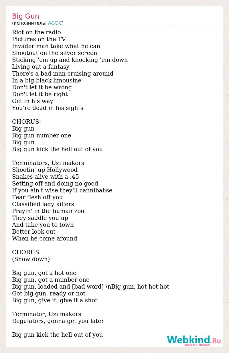 Riot on the radio Pictures on the TV Invader man take what he can Shootout on the silver screen Sticking 'em up and knocking 'em down Living out a fantasy There's a bad man cruising around In a big black limousine Don't let it be wrong Don't let it be right Get in his way You're dead in his sights CHORUS: Big gun Big gun number one Big gun Big gun kick the hell out of you Terminators, Uzi makers Shootin' up Hollywood Snakes alive with a .45 Setting off and doing no good If you ain't wise they'll cannibalise Tear flesh off you Classified lady killers Prayin' in the human zoo They saddle you up And take you to town Better look out When he come around CHORUS (Show down) Big gun, got a hot one Big gun, got a number one Big gun, loaded and [bad word] \nBig gun, hot hot hot Got big gun, ready or not Big gun, give it, give it a shot Terminator, Uzi makers Regulators, gonna get you later Big gun kick the hell out of you