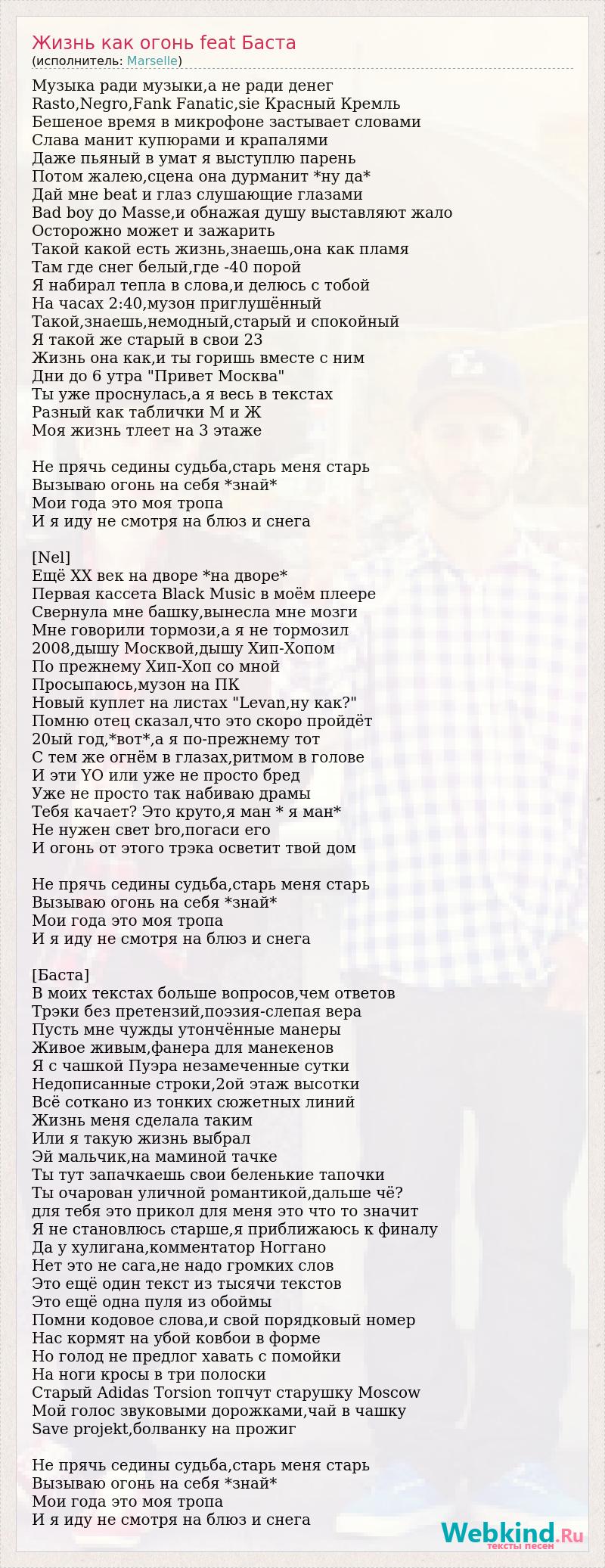Музыка ради музыки,а не ради денег Rasto,Negro,Fank Fanatic,sie Красный Кремль Бешеное время в микрофоне застывает словами Слава манит купюрами и крапалями Даже пьяный в умат я выступлю парень Потом жалею,сцена она дурманит *ну да* Дай мне beat и глаз слушающие глазами Bad boy до Masse,и обнажая душу выставляют жало Осторожно может и зажарить Такой какой есть жизнь,знаешь,она как пламя Там где снег белый,где -40 порой Я набирал тепла в слова,и делюсь с тобой На часах 2:40,музон приглушённый Такой,знаешь,немодный,старый и спокойный Я такой же старый в свои 23 Жизнь она как,и ты горишь вместе с ним Дни до 6 утра "Привет Москва" Ты уже проснулась,а я весь в текстах Разный как таблички М и Ж Моя жизнь тлеет на 3 этаже Не прячь седины судьба,старь меня старь Вызываю огонь на себя *знай* Мои года это моя тропа И я иду не смотря на блюз и снега [Nel] Ещё XX век на дворе *на дворе* Первая кассета Black Music в моём плеере Свернула мне башку,вынесла мне мозги Мне говорили тормози,а я не тормозил 2008,дышу Москвой,дышу Хип-Хопом По прежнему Хип-Хоп со мной Просыпаюсь,музон на ПК Новый куплет на листах "Levan,ну как?" Помню отец сказал,что это скоро пройдёт 20ый год,*вот*,а я по-прежнему тот С тем же огнём в глазах,ритмом в голове И эти YO или уже не просто бред Уже не просто так набиваю драмы Тебя качает? Это круто,я ман * я ман* Не нужен свет brо,погаси его И огонь от этого трэка осветит твой дом Не прячь седины судьба,старь меня старь Вызываю огонь на себя *знай* Мои года это моя тропа И я иду не смотря на блюз и снега [Баста] В моих текстах больше вопросов,чем ответов Трэки без претензий,поэзия-слепая вера Пусть мне чужды утончённые манеры Живое живым,фанера для манекенов Я с чашкой Пуэра незамеченные сутки Недописанные строки,2ой этаж высотки Всё соткано из тонких сюжетных линий Жизнь меня сделала таким Или я такую жизнь выбрал Эй мальчик,на маминой тачке Ты тут запачкаешь свои беленькие тапочки Ты очарован уличной романтикой,дальше чё? для тебя это прикол для меня это что то значит Я не становлюсь старше,я приближаюсь к финалу Да у хулигана,комментатор Ноггано Нет это не сага,не надо громких слов Это ещё один текст из тысячи текстов Это ещё одна пуля из обоймы Помни кодовое слова,и свой порядковый номер Нас кормят на убой ковбои в форме Но голод не предлог хавать с помойки На ноги кросы в три полоски Старый Adidas Torsion топчут старушку Moscow Мой голос звуковыми дорожками,чай в чашку Save projekt,болванку на прожиг Не прячь седины судьба,старь меня старь Вызываю огонь на себя *знай* Мои года это моя тропа И я иду не смотря на блюз и снега