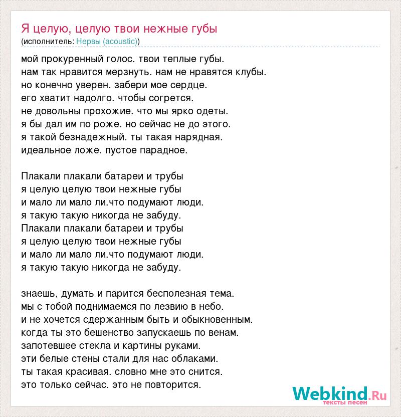 мой прокуренный голос. твои теплые губы. нам так нравится мерзнуть. нам не нравятся клубы. но конечно уверен. забери мое сердце. его хватит надолго. чтобы согрется. не довольны прохожие. что мы ярко одеты. я бы дал им по роже. но сейчас не до этого. я такой безнадежный. ты такая нарядная. идеальное ложе. пустое парадное. Плакали плакали батареи и трубы я целую целую твои нежные губы и мало ли мало ли.что подумают люди. я такую такую никогда не забуду. Плакали плакали батареи и трубы я целую целую твои нежные губы и мало ли мало ли.что подумают люди. я такую такую никогда не забуду. знаешь, думать и парится бесполезная тема. мы с тобой поднимаемся по лезвию в небо. и не хочется сдержанным быть и обыкновенным. когда ты это бешенство запускаешь по венам. запотевшее стекла и картины руками. эти белые стены стали для нас облаками. ты такая красивая. словно мне это снится. это только сейчас. это не повторится.