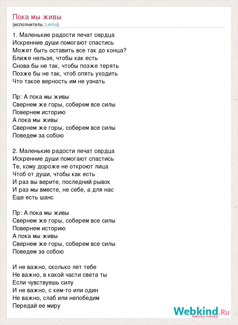 1. Маленькие радости лечат сердца Искренние души помогают спастись Может быть оставить все так до конца? Ближе нельзя, чтобы как есть Снова бы не так, чтобы позже терять Позже бы не так, чтоб опять уходить Что такое верность им не узнать Пр: А пока мы живы Свернем же горы, соберем все силы Повернем историю А пока мы живы Свернем же горы, соберем все силы Поведем за собою 2. Маленькие радости лечат сердца Искренние души помогают спастись Те, кому дороже не откроют лица Чтоб от души, чтобы как есть И раз вы верите, последний рывок И раз мы вместе, не себе, а для нас Еще есть шанс Пр: А пока мы живы Свернем же горы, соберем все силы Повернем историю А пока мы живы Свернем же горы, соберем все силы Поведем за собою И не важно, сколько лет тебе Не важно, в какой части света ты Если чувствуешь силу И не важно, с кем-то или один Не важно, слаб или непобедим Передай ее миру