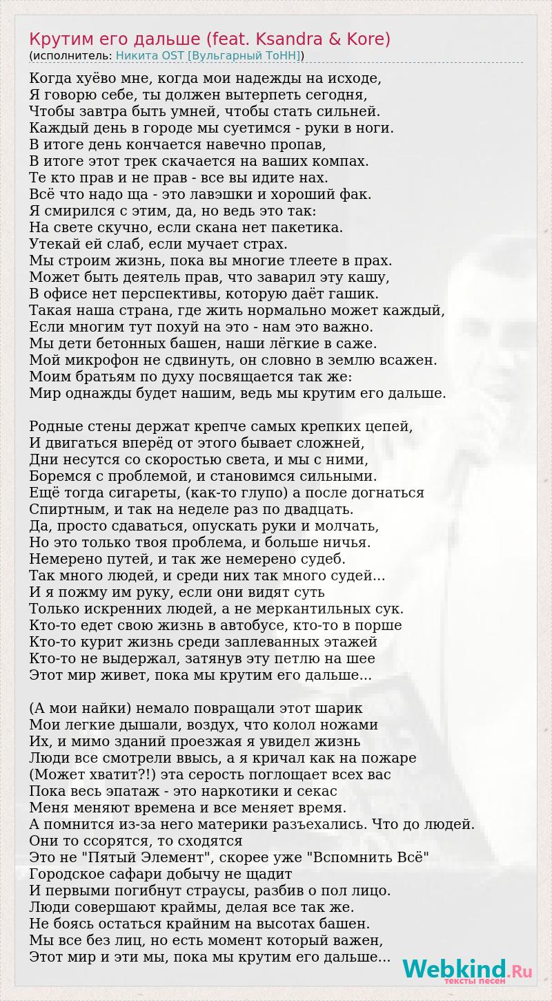 Когда хуёво мне, когда мои надежды на исходе, Я говорю себе, ты должен вытерпеть сегодня, Чтобы завтра быть умней, чтобы стать сильней. Каждый день в городе мы суетимся - руки в ноги. В итоге день кончается навечно пропав, В итоге этот трек скачается на ваших компах. Те кто прав и не прав - все вы идите нах. Всё что надо ща - это лавэшки и хороший фак. Я смирился с этим, да, но ведь это так: На свете скучно, если скана нет пакетика. Утекай ей слаб, если мучает страх. Мы строим жизнь, пока вы многие тлеете в прах. Может быть деятель прав, что заварил эту кашу, В офисе нет перспективы, которую даёт гашик. Такая наша страна, где жить нормально может каждый, Если многим тут похуй на это - нам это важно. Мы дети бетонных башен, наши лёгкие в саже. Мой микрофон не сдвинуть, он словно в землю всажен. Моим братьям по духу посвящается так же: Мир однажды будет нашим, ведь мы крутим его дальше. Родные стены держат крепче самых крепких цепей, И двигаться вперёд от этого бывает сложней, Дни несутся со скоростью света, и мы с ними, Боремся с проблемой, и становимся сильными. Ещё тогда сигареты, (как-то глупо) а после догнаться Спиртным, и так на неделе раз по двадцать. Да, просто сдаваться, опускать руки и молчать, Но это только твоя проблема, и больше ничья. Немерено путей, и так же немерено судеб. Так много людей, и среди них так много судей... И я пожму им руку, если они видят суть Только искренних людей, а не меркантильных сук. Кто-то едет свою жизнь в автобусе, кто-то в порше Кто-то курит жизнь среди заплеванных этажей Кто-то не выдержал, затянув эту петлю на шее Этот мир живет, пока мы крутим его дальше... (А мои найки) немало повращали этот шарик Мои легкие дышали, воздух, что колол ножами Их, и мимо зданий проезжая я увидел жизнь Люди все смотрели ввысь, а я кричал как на пожаре (Может хватит?!) эта серость поглощает всех вас Пока весь эпатаж - это наркотики и секас Меня меняют времена и все меняет время. А помнится из-за него материки разъехались. Что до людей. Они то ссорятся, то сходятся Это не "Пятый Элемент", скорее уже "Вспомнить Всё" Городское сафари добычу не щадит И первыми погибнут страусы, разбив о пол лицо. Люди совершают краймы, делая все так же. Не боясь остаться крайним на высотах башен. Мы все без лиц, но есть момент который важен, Этот мир и эти мы, пока мы крутим его дальше...