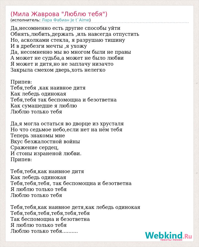 Да,несомненно есть другие способы уйти Обнять,любить,держать ,иль навсегда отпустить Но, асколками стекла, я разрушаю тишину И в дребезги мечты ,я ухожу Да, несомненно мы во многом были не правы А может не судьба,а может не было любви Я может и дитя,но не заплачу низачто Закрыла смехом дверь,хоть нелегко Припев: Тебя,тебя ,как наивное дитя Как лебедь одинокая Тебя,тебя так беспомощна и безответна Как сумашедше я люблю Люблю только тебя Да,я могла остаться во дворце из хрусталя Но что седьмое небо,если нет на нём тебя Теперь знакомы мне Вкус безжалостной войны Сражение сердец, И стоны израненой любви. Припев: Тебя,тебя,как наивное дитя Как лебедь одинокая Тебя,тебя,тебя, так беспомощна и безответна Я люблю только тебя Люблю только тебя Тебя,тебя,как наивное детя,как лебедь одинокая Тебя,тебя,тебя,тебя,тебя,тебя Так беспомощна и безответна Я люблю только тебя Люблю только тебя..........