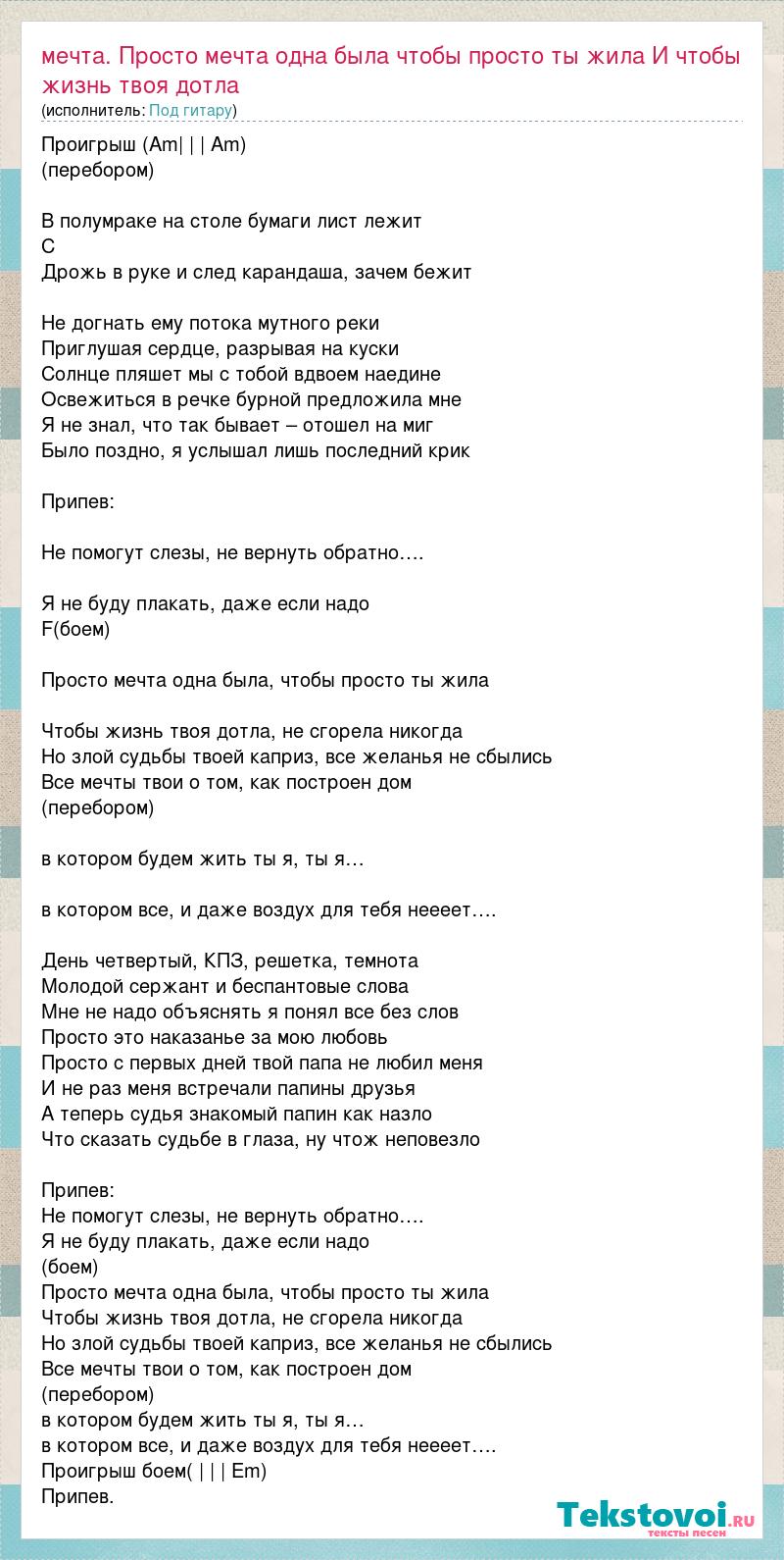 Проигрыш (Am| | | Am) (перебором) В полумраке на столе бумаги лист лежит С Дрожь в руке и след карандаша, зачем бежит Не догнать ему потока мутного реки Приглушая сердце, разрывая на куски Солнце пляшет мы с тобой вдвоем наедине Освежиться в речке бурной предложила мне Я не знал, что так бывает – отошел на миг Было поздно, я услышал лишь последний крик Припев: Не помогут слезы, не вернуть обратно…. Я не буду плакать, даже если надо F(боем) Просто мечта одна была, чтобы просто ты жила Чтобы жизнь твоя дотла, не сгорела никогда Но злой судьбы твоей каприз, все желанья не сбылись Все мечты твои о том, как построен дом (перебором) в котором будем жить ты я, ты я… в котором все, и даже воздух для тебя неееет…. День четвертый, КПЗ, решетка, темнота Молодой сержант и беспантовые слова Мне не надо объяснять я понял все без слов Просто это наказанье за мою любовь Просто с первых дней твой папа не любил меня И не раз меня встречали папины друзья А теперь судья знакомый папин как назло Что сказать судьбе в глаза, ну чтож неповезло Припев: Не помогут слезы, не вернуть обратно…. Я не буду плакать, даже если надо (боем) Просто мечта одна была, чтобы просто ты жила Чтобы жизнь твоя дотла, не сгорела никогда Но злой судьбы твоей каприз, все желанья не сбылись Все мечты твои о том, как построен дом (перебором) в котором будем жить ты я, ты я… в котором все, и даже воздух для тебя неееет…. Проигрыш боем( | | | Em) Припев.