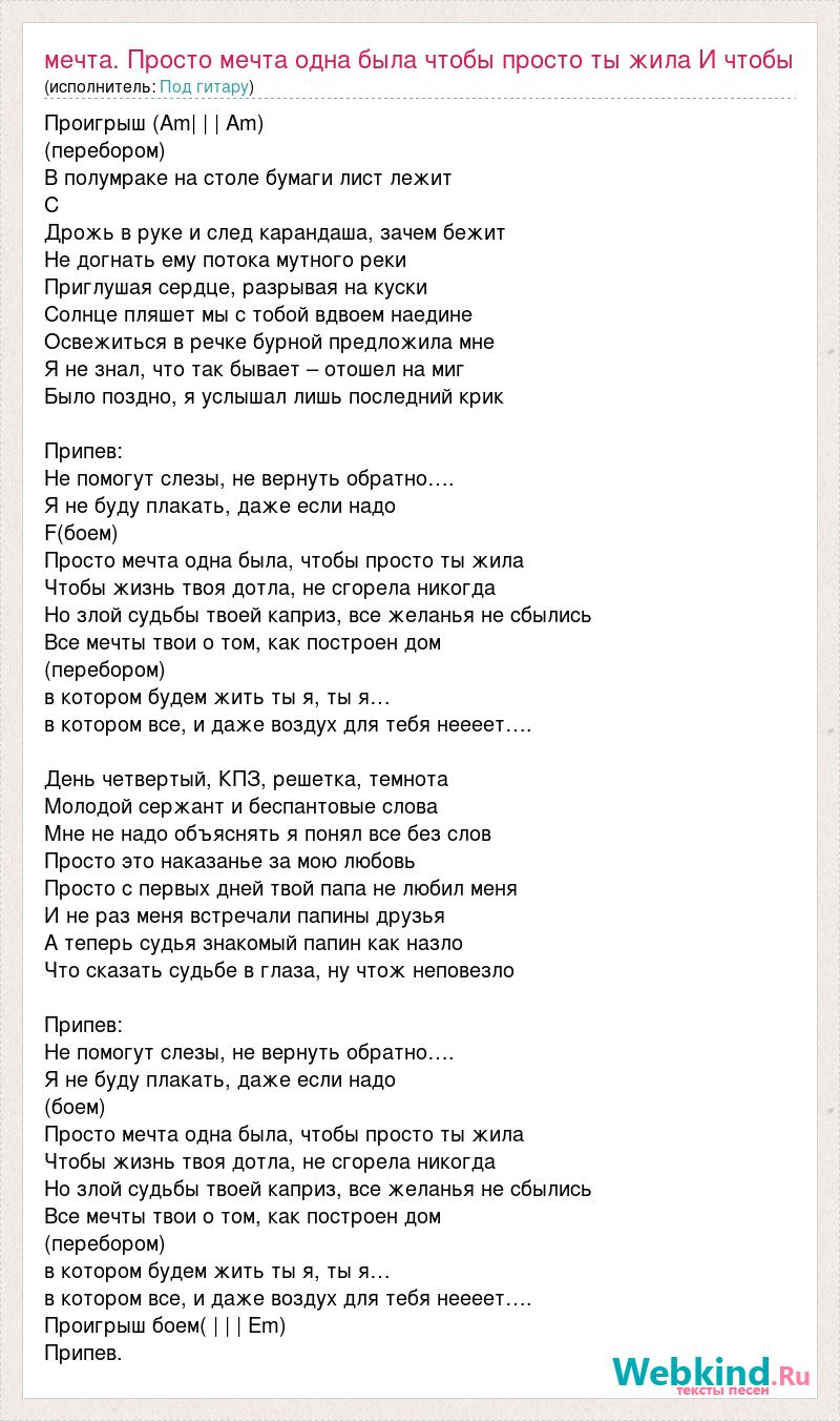 Проигрыш (Am| | | Am) (перебором) В полумраке на столе бумаги лист лежит С Дрожь в руке и след карандаша, зачем бежит Не догнать ему потока мутного реки Приглушая сердце, разрывая на куски Солнце пляшет мы с тобой вдвоем наедине Освежиться в речке бурной предложила мне Я не знал, что так бывает – отошел на миг Было поздно, я услышал лишь последний крик Припев: Не помогут слезы, не вернуть обратно…. Я не буду плакать, даже если надо F(боем) Просто мечта одна была, чтобы просто ты жила Чтобы жизнь твоя дотла, не сгорела никогда Но злой судьбы твоей каприз, все желанья не сбылись Все мечты твои о том, как построен дом (перебором) в котором будем жить ты я, ты я… в котором все, и даже воздух для тебя неееет…. День четвертый, КПЗ, решетка, темнота Молодой сержант и беспантовые слова Мне не надо объяснять я понял все без слов Просто это наказанье за мою любовь Просто с первых дней твой папа не любил меня И не раз меня встречали папины друзья А теперь судья знакомый папин как назло Что сказать судьбе в глаза, ну чтож неповезло Припев: Не помогут слезы, не вернуть обратно…. Я не буду плакать, даже если надо (боем) Просто мечта одна была, чтобы просто ты жила Чтобы жизнь твоя дотла, не сгорела никогда Но злой судьбы твоей каприз, все желанья не сбылись Все мечты твои о том, как построен дом (перебором) в котором будем жить ты я, ты я… в котором все, и даже воздух для тебя неееет…. Проигрыш боем( | | | Em) Припев.