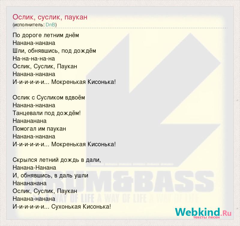 По дороге летним днём Нанана-нанана Шли, обнявшись, под дождём На-на-на-на-на Ослик, Суслик, Паукан Нанана-нанана И-и-и-и-и-и... Мокренькая Кисонька! Ослик с Сусликом вдвоём Нанана-нанана Танцевали под дождём! Нанананана Помогал им паукан Нанана-нанана И-и-и-и-и-и... Мокренькая Кисонька! Скрылся летний дождь в дали, Нанана-Нанана И, обнявшись, в даль ушли Нанананана Ослик, Суслик, Паукан Нанана-нанана И-и-и-и-и-и... Сухонькая Кисонька!