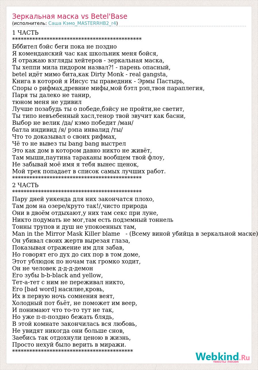 1 ЧАСТЬ ********************************************* Бббител бэйс беги пока не поздно Я коменданский час как школьник меня бойся, Я отражаю взгляды хейтеров - зеркальная маска, Ты хеппи мила пидором назвал?! - парень опасный, betel идёт мимо бита,как Dirty Monk - real gangsta, Книга в которой я Иисус ты праведник - Эрмы Пастырь, Споры о рифмах,древние мифы,мой бэтл рэп,твоя параплегия, Паря ты далеко не танир, тюном меня не удивил Лучше позабудь ты о победе,бэйсу не пройти,не светит, Ты типо невъебенный хасл,тенор твой звучит как басни, Выбор не велик /да/ кэмо победит /ман/ батла индивид /я/ рэпа инвалид /ты/ Что то доказывал о своих рифмах, Чё то не вывез ты bang bang выстрел Это как дом в котором давно никто не живёт, Там мыши,паутина тараканы вообщем твой флоу, Не забывай моё имя я тебя вынес щенок, Мой трек попадает в список самых лучших работ. ********************************************* 2 ЧАСТЬ ********************************************* Пару дней уикенда для них закончатся плохо, Там дом на озере/круто так!/,чисто природа Они в двоём отдыхают,у них там секс при луне, Никто подумать не мог,там есть подземный тоннель Тонны трупов и душ не упокоенных там, Man in the Mirror Mask Killer blame - (Всему виной убийца в зеркальной маске) Он убивал своих жертв вырезая глаза, Показывая отражение им для забав, Но говорят его дух до сих пор в том доме, Этот ублюдок по ночам так громко ходит, Он не человек д-д-д-демон Его зубы b-b-black and yellow, Тет-а-тет с ним не переживал никто, Его [bad word] насилие,кровь, Их в первую ночь сомнения веят, Холодный пот бьёт, не поможет им веер, И понимают что то-то тут не так, Но уже п-п-поздно бежать блядь, В этой комнате закончилась вся любовь, Не увидят никогда они больше снов, Заебись так отдохнули ценою в жизнь, Просто нехуй было верить в миражи. ******************************************