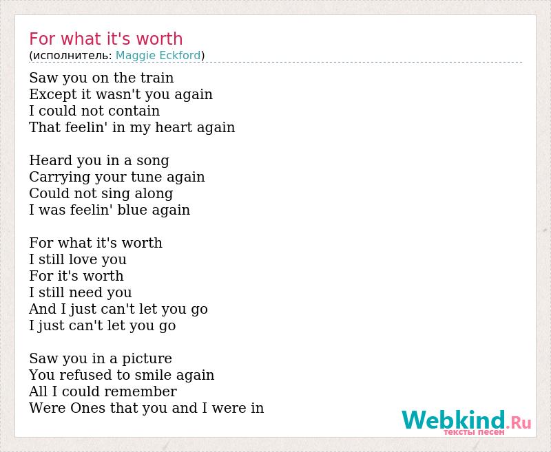 Saw you on the train Except it wasn't you again I could not contain That feelin' in my heart again Heard you in a song Carrying your tune again Could not sing along I was feelin' blue again For what it's worth I still love you For it's worth I still need you And I just can't let you go I just can't let you go Saw you in a picture You refused to smile again All I could remember Were Ones that you and I were in