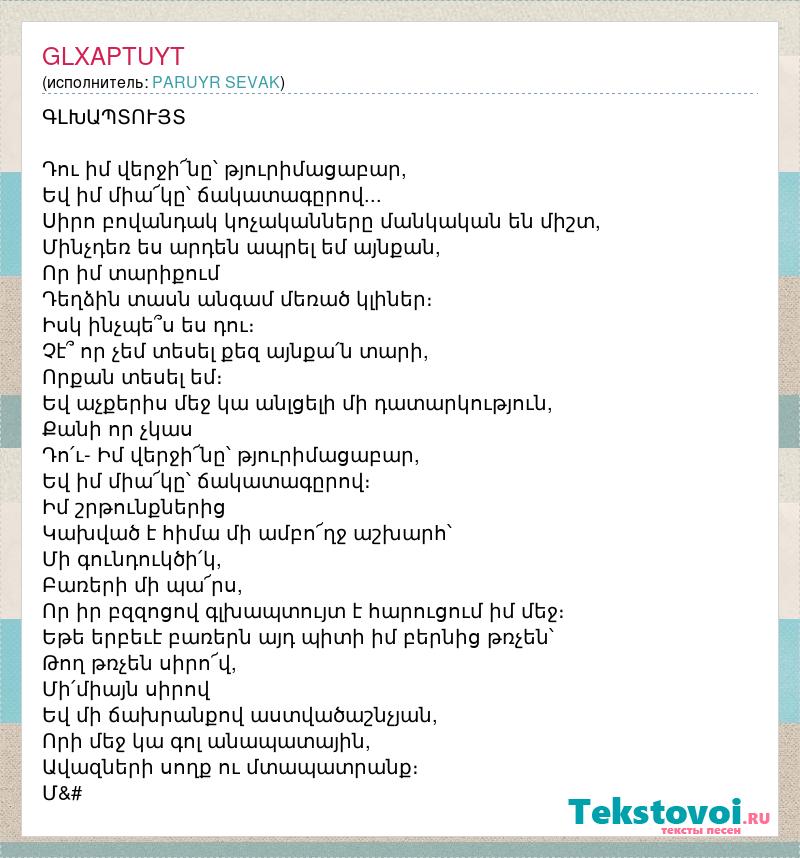 ԳԼԽԱՊՏՈՒՅՏ Դու իմ վերջի՜նը՝ թյուրիմացաբար, Եվ իմ միա՜կը՝ ճակատագըրով... Սիրո բովանդակ կոչականները մանկական են միշտ, Մինչդեռ ես արդեն ապրել եմ այնքան, Որ իմ տարիքում Դեղձին տասն անգամ մեռած կլիներ։ Իսկ ինչպե՞ս ես դու։ Չէ՞ որ չեմ տեսել քեզ այնքա՛ն տարի, Որքան տեսել եմ։ Եվ աչքերիս մեջ կա անլցելի մի դատարկություն, Քանի որ չկաս Դո՛ւ- Իմ վերջի՜նը՝ թյուրիմացաբար, Եվ իմ միա՜կը՝ ճակատագըրով։ Իմ շրթունքներից Կախված է հիմա մի ամբո՜ղջ աշխարհ՝ Մի գունդուկծի՛կ, Բառերի մի պա՜րս, Որ իր բզզոցով գլխապտույտ է հարուցում իմ մեջ։ Եթե երբեւէ բառերն այդ պիտի իմ բերնից թռչեն՝ Թող թռչեն սիրո՜վ, Մի՛միայն սիրով Եվ մի ճախրանքով աստվածաշնչյան, Որի մեջ կա գոլ անապատային, Ավազների սողք ու մտապատրանք։ Մ