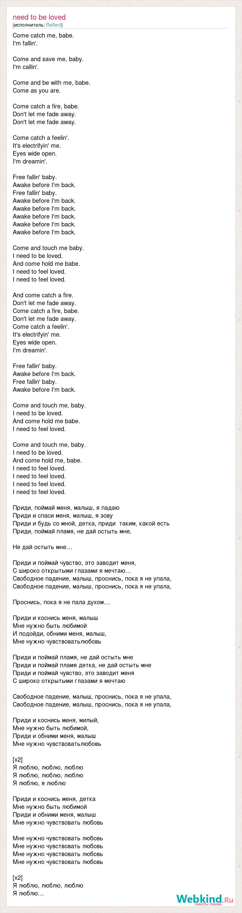Come catch me, babe. I'm fallin'. Come and save me, baby. I'm callin'. Come and be with me, babe. Come as you are. Come catch a fire, babe. Don't let me fade away. Don't let me fade away. Come catch a feelin'. It's electrifyin' me. Eyes wide open. I'm dreamin'. Free fallin' baby. Awake before I'm back. Free fallin' baby. Awake before I'm back. Awake before I'm back. Awake before I'm back. Awake before I'm back. Awake before I'm back. Come and touch me baby. I need to be loved. And come hold me babe. I need to feel loved. I need to feel loved. And come catch a fire. Don't let me fade away. Come catch a fire, babe. Don't let me fade away. Come catch a feelin'. It's electrifyin' me. Eyes wide open. I'm dreamin'. Free fallin' baby. Awake before I'm back. Free fallin' baby. Awake before I'm back. Come and touch me, baby. I need to be loved. And come hold me babe. I need to feel loved. Come and touch me, baby. I need to be loved. And come hold me, babe. I need to feel loved. I need to feel loved. I need to feel loved. I need to feel loved. Приди, поймай меня, малыш, я падаю Приди и спаси меня, малыш, я зову Приди и будь со мной, детка, приди таким, какой есть Приди, поймай пламя, не дай остыть мне, Не дай остыть мне… Приди и поймай чувство, это заводит меня, С широко открытыми глазами я мечтаю… Свободное падение, малыш, проснись, пока я не упала, Свободное падение, малыш, проснись, пока я не упала, Проснись, пока я не пала духом… Приди и коснись меня, малыш Мне нужно быть любимой И подойди, обними меня, малыш, Мне нужно чувствоватьлюбовь Приди и поймай пламя, не дай остыть мне Приди и поймай пламя детка, не дай остыть мне Приди и поймай чувство, это заводит меня С широко открытыми глазами я мечтаю Свободное падение, малыш, проснись, пока я не упала, Свободное падение, малыш, проснись, пока я не упала, Приди и коснись меня, милый, Мне нужно быть любимой, Приди и обними меня, малыш Мне нужно чувствоватьлюбовь [x2] Я люблю, люблю, люблю Я люблю, люблю, люблю Я люблю, я люблю Приди и коснись меня, детка Мне нужно быть любимой Приди и обними меня, малыш Мне нужно чувствовать любовь Мне нужно чувствовать любовь Мне нужно чувствовать любовь Мне нужно чувствовать любовь Мне нужно чувствовать любовь [x2] Я люблю, люблю, люблю Я люблю…