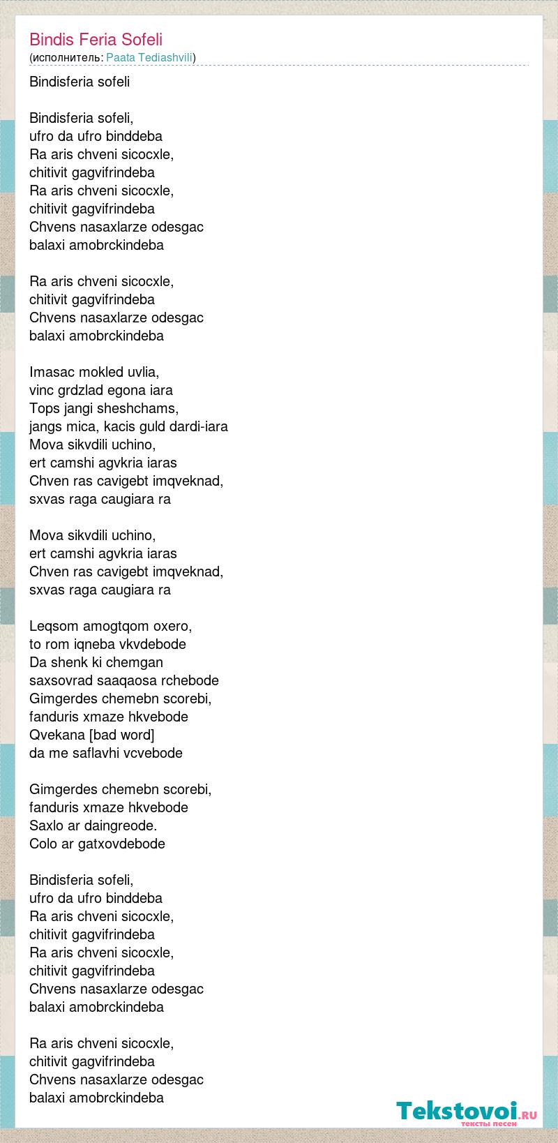 Bindisferia sofeli Bindisferia sofeli, ufro da ufro binddeba Ra aris chveni sicocxle, chitivit gagvifrindeba Ra aris chveni sicocxle, chitivit gagvifrindeba Chvens nasaxlarze odesgac balaxi amobrckindeba Ra aris chveni sicocxle, chitivit gagvifrindeba Chvens nasaxlarze odesgac balaxi amobrckindeba Imasac mokled uvlia, vinc grdzlad egona iara Tops jangi sheshchams, jangs mica, kacis guld dardi-iara Mova sikvdili uchino, ert camshi agvkria iaras Chven ras cavigebt imqveknad, sxvas raga caugiara ra Mova sikvdili uchino, ert camshi agvkria iaras Chven ras cavigebt imqveknad, sxvas raga caugiara ra Leqsom amogtqom oxero, to rom iqneba vkvdebode Da shenk ki chemgan saxsovrad saaqaosa rchebode Gimgerdes chemebn scorebi, fanduris xmaze hkvebode Qvekana mxiarulebdes da me saflavhi vcvebode Gimgerdes chemebn scorebi, fanduris xmaze hkvebode Saxlo ar daingreode. Colo ar gatxovdebode Bindisferia sofeli, ufro da ufro binddeba Ra aris chveni sicocxle, chitivit gagvifrindeba Ra aris chveni sicocxle, chitivit gagvifrindeba Chvens nasaxlarze odesgac balaxi amobrckindeba Ra aris chveni sicocxle, chitivit gagvifrindeba Chvens nasaxlarze odesgac balaxi amobrckindeba
