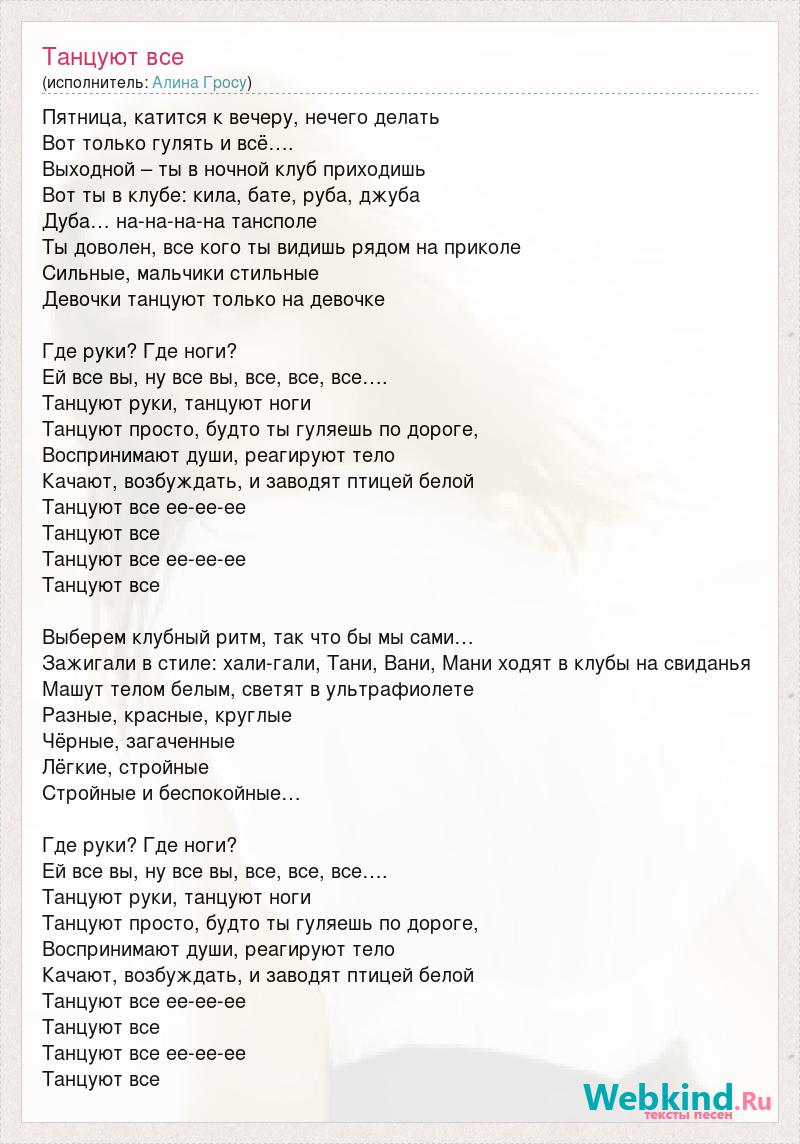 Пятница, катится к вечеру, нечего делать Вот только гулять и всё…. Выходной – ты в ночной клуб приходишь Вот ты в клубе: кила, бате, руба, джуба Дуба… на-на-на-на тансполе Ты доволен, все кого ты видишь рядом на приколе Сильные, мальчики стильные Девочки танцуют только на девочке Где руки? Где ноги? Ей все вы, ну все вы, все, все, все…. Танцуют руки, танцуют ноги Танцуют просто, будто ты гуляешь по дороге, Воспринимают души, реагируют тело Качают, возбуждать, и заводят птицей белой Танцуют все ее-ее-ее Танцуют все Танцуют все ее-ее-ее Танцуют все Выберем клубный ритм, так что бы мы сами… Зажигали в стиле: хали-гали, Тани, Вани, Мани ходят в клубы на свиданья Машут телом белым, светят в ультрафиолете Разные, красные, круглые Чёрные, загаченные Лёгкие, стройные Стройные и беспокойные… Где руки? Где ноги? Ей все вы, ну все вы, все, все, все…. Танцуют руки, танцуют ноги Танцуют просто, будто ты гуляешь по дороге, Воспринимают души, реагируют тело Качают, возбуждать, и заводят птицей белой Танцуют все ее-ее-ее Танцуют все Танцуют все ее-ее-ее Танцуют все