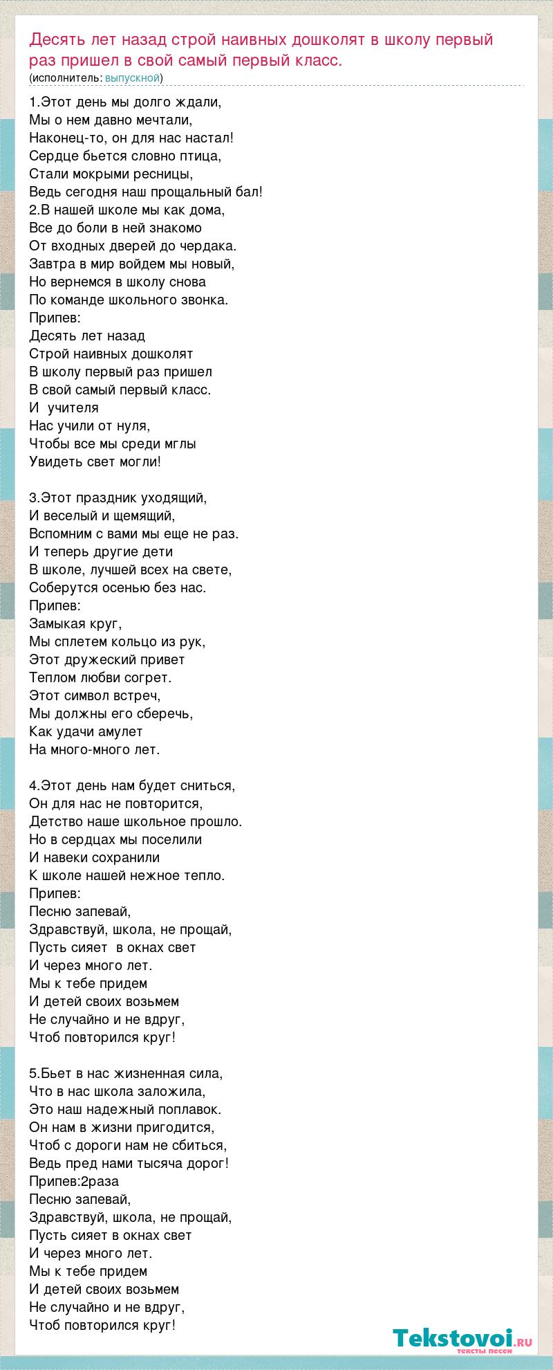 1.Этот день мы долго ждали, Мы о нем давно мечтали, Наконец-то, он для нас настал! Сердце бьется словно птица, Стали мокрыми ресницы, Ведь сегодня наш прощальный бал! 2.В нашей школе мы как дома, Все до боли в ней знакомо От входных дверей до чердака. Завтра в мир войдем мы новый, Но вернемся в школу снова По команде школьного звонка. Припев: Десять лет назад Строй наивных дошколят В школу первый раз пришел В свой самый первый класс. И учителя Нас учили от нуля, Чтобы все мы среди мглы Увидеть свет могли! 3.Этот праздник уходящий, И веселый и щемящий, Вспомним с вами мы еще не раз. И теперь другие дети В школе, лучшей всех на свете, Соберутся осенью без нас. Припев: Замыкая круг, Мы сплетем кольцо из рук, Этот дружеский привет Теплом любви согрет. Этот символ встреч, Мы должны его сберечь, Как удачи амулет На много-много лет. 4.Этот день нам будет сниться, Он для нас не повторится, Детство наше школьное прошло. Но в сердцах мы поселили И навеки сохранили К школе нашей нежное тепло. Припев: Песню запевай, Здравствуй, школа, не прощай, Пусть сияет в окнах свет И через много лет. Мы к тебе придем И детей своих возьмем Не случайно и не вдруг, Чтоб повторился круг! 5.Бьет в нас жизненная сила, Что в нас школа заложила, Это наш надежный поплавок. Он нам в жизни пригодится, Чтоб с дороги нам не сбиться, Ведь пред нами тысяча дорог! Припев:2раза Песню запевай, Здравствуй, школа, не прощай, Пусть сияет в окнах свет И через много лет. Мы к тебе придем И детей своих возьмем Не случайно и не вдруг, Чтоб повторился круг!