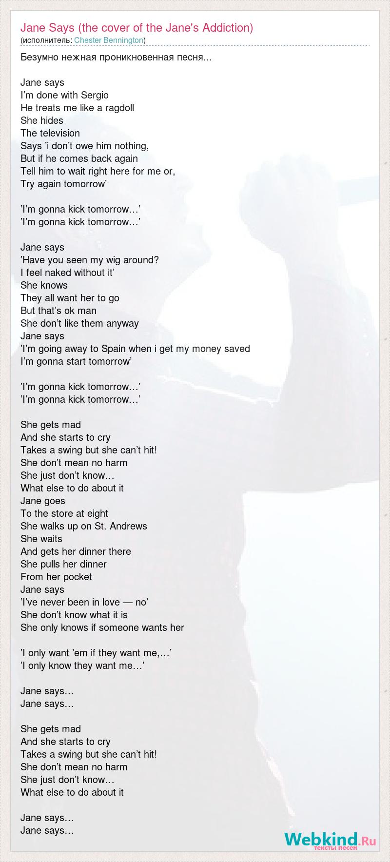 Безумно нежная проникновенная песня... Jane says I’m done with Sergio He treats me like a ragdoll She hides The television Says ’i don’t owe him nothing, But if he comes back again Tell him to wait right here for me or, Try again tomorrow’ ’I’m gonna kick tomorrow…’ ’I’m gonna kick tomorrow…’ Jane says ’Have you seen my wig around? I feel naked without it’ She knows They all want her to go But that’s ok man She don’t like them anyway Jane says ’I’m going away to Spain when i get my money saved I’m gonna start tomorrow’ ’I’m gonna kick tomorrow…’ ’I’m gonna kick tomorrow…’ She gets mad And she starts to cry Takes a swing but she can’t hit! She don’t mean no harm She just don’t know… What else to do about it Jane goes To the store at eight She walks up on St. Andrews She waits And gets her dinner there She pulls her dinner From her pocket Jane says ’I’ve never been in love — no’ She don’t know what it is She only knows if someone wants her ’I only want ’em if they want me,…’ ’I only know they want me…’ Jane says… Jane says… She gets mad And she starts to cry Takes a swing but she can’t hit! She don’t mean no harm She just don’t know… What else to do about it Jane says… Jane says…