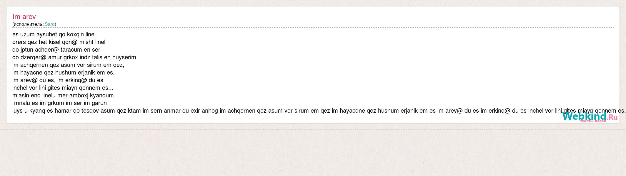 es uzum aysuhet qo koxqin linel orers qez het kisel qon@ misht linel qo jptun achqer@ taracum en ser qo dzerqer@ amur grkox indz talis en huyserim im achqernen qez asum vor sirum em qez, im hayacne qez hushum erjanik em es. im arev@ du es, im erkinq@ du es inchel vor lini gites miayn qonnem es... miasin enq linelu mer amboxj kyanqum mnalu es im grkum im ser im garun luys u kyanq es hamar qo tesqov asum qez ktam im sern anmar du exir anhog im achqernen qez asum vor sirum em qez im hayacqne qez hushum erjanik em es im arev@ du es im erkinq@ du es inchel vor lini gites miayn qonnem es.