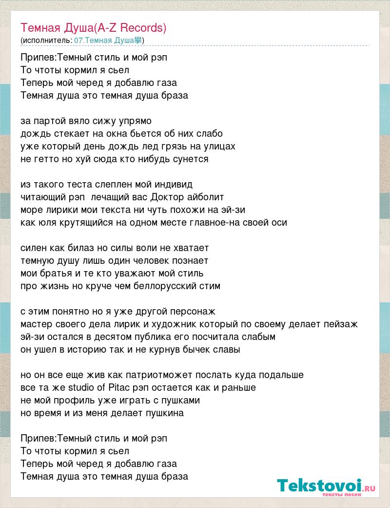 Припев:Темный стиль и мой рэп То чтоты кормил я сьел Теперь мой черед я добавлю газа Темная душа это темная душа браза за партой вяло сижу упрямо дождь стекает на окна бьется об них слабо уже который день дождь лед грязь на улицах не гетто но хуй сюда кто нибудь сунется из такого теста слеплен мой индивид читающий рэп лечащий вас Доктор айболит море лирики мои текста ни чуть похожи на эй-зи как юля крутящийся на одном месте главное-на своей оси силен как билаз но силы воли не хватает темную душу лишь один человек познает мои братья и те кто уважают мой стиль про жизнь но круче чем беллорусский стим с этим понятно но я уже другой персонаж мастер своего дела лирик и художник который по своему делает пейзаж эй-зи остался в десятом публика его посчитала слабым он ушел в историю так и не курнув бычек славы но он все еще жив как патриотможет послать куда подальше все та же studio of Pitac рэп остается как и раньше не мой профиль уже играть с пушками но время и из меня делает пушкина Припев:Темный стиль и мой рэп То чтоты кормил я сьел Теперь мой черед я добавлю газа Темная душа это темная душа браза