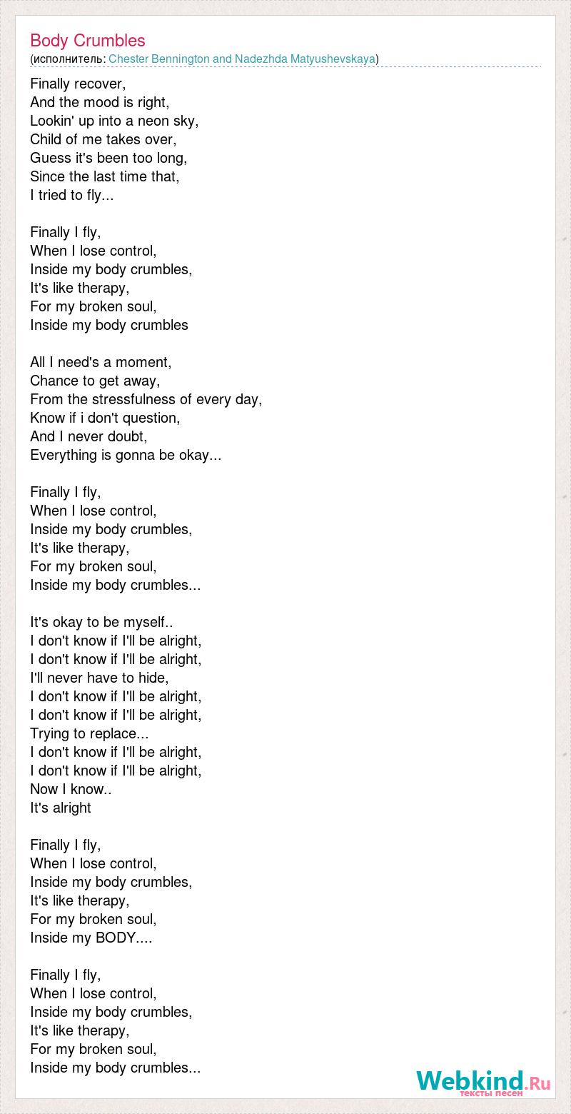 Finally recover, And the mood is right, Lookin' up into a neon sky, Child of me takes over, Guess it's been too long, Since the last time that, I tried to fly... Finally I fly, When I lose control, Inside my body crumbles, It's like therapy, For my broken soul, Inside my body crumbles All I need's a moment, Chance to get away, From the stressfulness of every day, Know if i don't question, And I never doubt, Everything is gonna be okay... Finally I fly, When I lose control, Inside my body crumbles, It's like therapy, For my broken soul, Inside my body crumbles... It's okay to be myself.. I don't know if I'll be alright, I don't know if I'll be alright, I'll never have to hide, I don't know if I'll be alright, I don't know if I'll be alright, Trying to replace... I don't know if I'll be alright, I don't know if I'll be alright, Now I know.. It's alright Finally I fly, When I lose control, Inside my body crumbles, It's like therapy, For my broken soul, Inside my BODY.... Finally I fly, When I lose control, Inside my body crumbles, It's like therapy, For my broken soul, Inside my body crumbles...