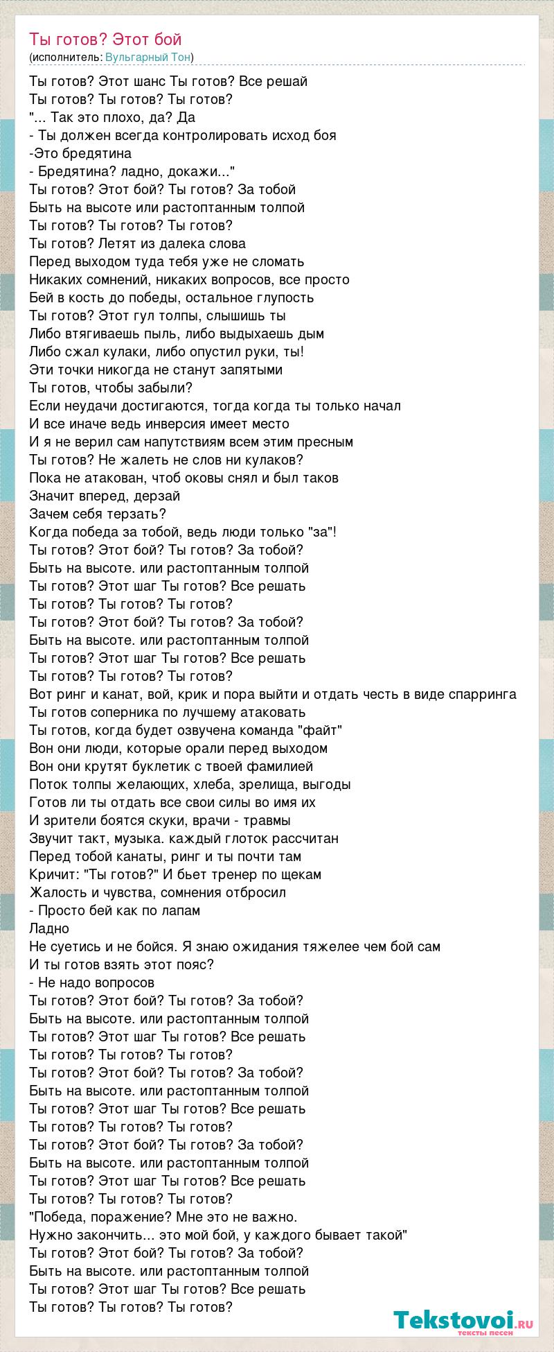 Ты готов? Этот шанс Ты готов? Все решай Ты готов? Ты готов? Ты готов? "... Так это плохо, да? Да - Ты должен всегда контролировать исход боя -Это бредятина - Бредятина? ладно, докажи..." Ты готов? Этот бой? Ты готов? За тобой Быть на высоте или растоптанным толпой Ты готов? Ты готов? Ты готов? Ты готов? Летят из далека слова Перед выходом туда тебя уже не сломать Никаких сомнений, никаких вопросов, все просто Бей в кость до победы, остальное глупость Ты готов? Этот гул толпы, слышишь ты Либо втягиваешь пыль, либо выдыхаешь дым Либо сжал кулаки, либо опустил руки, ты! Эти точки никогда не станут запятыми Ты готов, чтобы забыли? Если неудачи достигаются, тогда когда ты только начал И все иначе ведь инверсия имеет место И я не верил сам напутствиям всем этим пресным Ты готов? Не жалеть не слов ни кулаков? Пока не атакован, чтоб оковы снял и был таков Значит вперед, дерзай Зачем себя терзать? Когда победа за тобой, ведь люди только "за"! Ты готов? Этот бой? Ты готов? За тобой? Быть на высоте. или растоптанным толпой Ты готов? Этот шаг Ты готов? Все решать Ты готов? Ты готов? Ты готов? Ты готов? Этот бой? Ты готов? За тобой? Быть на высоте. или растоптанным толпой Ты готов? Этот шаг Ты готов? Все решать Ты готов? Ты готов? Ты готов? Вот ринг и канат, вой, крик и пора выйти и отдать честь в виде спарринга Ты готов соперника по лучшему атаковать Ты готов, когда будет озвучена команда "файт" Вон они люди, которые орали перед выходом Вон они крутят буклетик с твоей фамилией Поток толпы желающих, хлеба, зрелища, выгоды Готов ли ты отдать все свои силы во имя их И зрители боятся скуки, врачи - травмы Звучит такт, музыка. каждый глоток рассчитан Перед тобой канаты, ринг и ты почти там Кричит: "Ты готов?" И бьет тренер по щекам Жалость и чувства, сомнения отбросил - Просто бей как по лапам Ладно Не суетись и не бойся. Я знаю ожидания тяжелее чем бой сам И ты готов взять этот пояс? - Не надо вопросов Ты готов? Этот бой? Ты готов? За тобой? Быть на высоте. или растоптанным толпой Ты готов? Этот шаг Ты готов? Все решать Ты готов? Ты готов? Ты готов? Ты готов? Этот бой? Ты готов? За тобой? Быть на высоте. или растоптанным толпой Ты готов? Этот шаг Ты готов? Все решать Ты готов? Ты готов? Ты готов? Ты готов? Этот бой? Ты готов? За тобой? Быть на высоте. или растоптанным толпой Ты готов? Этот шаг Ты готов? Все решать Ты готов? Ты готов? Ты готов? "Победа, поражение? Мне это не важно. Нужно закончить... это мой бой, у каждого бывает такой" Ты готов? Этот бой? Ты готов? За тобой? Быть на высоте. или растоптанным толпой Ты готов? Этот шаг Ты готов? Все решать Ты готов? Ты готов? Ты готов?