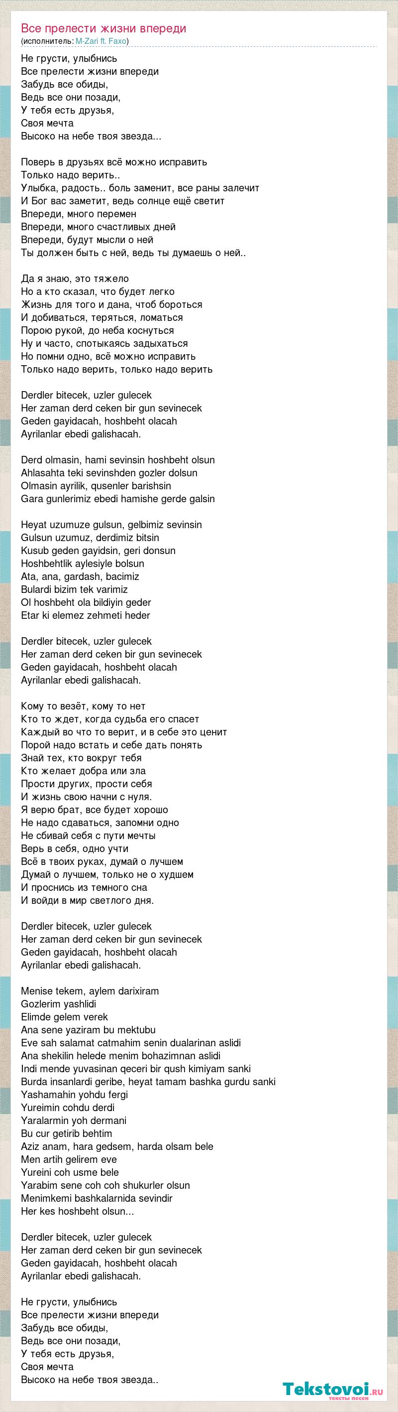 Не грусти, улыбнись Все прелести жизни впереди Забудь все обиды, Ведь все они позади, У тебя есть друзья, Своя мечта Высоко на небе твоя звезда... Поверь в друзьях всё можно исправить Только надо верить.. Улыбка, радость.. боль заменит, все раны залечит И Бог вас заметит, ведь солнце ещё светит Впереди, много перемен Впереди, много счастливых дней Впереди, будут мысли о ней Ты должен быть с ней, ведь ты думаешь о ней.. Да я знаю, это тяжело Но а кто сказал, что будет легко Жизнь для того и дана, чтоб бороться И добиваться, теряться, ломаться Порою рукой, до неба коснуться Ну и часто, спотыкаясь задыхаться Но помни одно, всё можно исправить Только надо верить, только надо верить Derdler bitecek, uzler gulecek Her zaman derd ceken bir gun sevinecek Geden gayidacah, hoshbeht olacah Ayrilanlar ebedi galishacah. Derd olmasin, hami sevinsin hoshbeht olsun Ahlasahta teki sevinshden gozler dolsun Olmasin ayrilik, qusenler barishsin Gara gunlerimiz ebedi hamishe gerde galsin Heyat uzumuze gulsun, gelbimiz sevinsin Gulsun uzumuz, derdimiz bitsin Kusub geden gayidsin, geri donsun Hoshbehtlik aylesiyle bolsun Ata, ana, gardash, bacimiz Bulardi bizim tek varimiz Ol hoshbeht ola bildiyin geder Etar ki elemez zehmeti heder Derdler bitecek, uzler gulecek Her zaman derd ceken bir gun sevinecek Geden gayidacah, hoshbeht olacah Ayrilanlar ebedi galishacah. Кому то везёт, кому то нет Кто то ждет, когда судьба его спасет Каждый во что то верит, и в себе это ценит Порой надо встать и себе дать понять Знай тех, кто вокруг тебя Кто желает добра или зла Прости других, прости себя И жизнь свою начни с нуля. Я верю брат, все будет хорошо Не надо сдаваться, запомни одно Не сбивай себя с пути мечты Верь в себя, одно учти Всё в твоих руках, думай о лучшем Думай о лучшем, только не о худшем И проснись из темного сна И войди в мир светлого дня. Derdler bitecek, uzler gulecek Her zaman derd ceken bir gun sevinecek Geden gayidacah, hoshbeht olacah Ayrilanlar ebedi galishacah. Menise tekem, aylem darixiram Gozlerim yashlidi Elimde gelem verek Ana sene yaziram bu mektubu Eve sah salamat catmahim senin dualarinan aslidi Ana shekilin helede menim bohazimnan aslidi Indi mende yuvasinan qeceri bir qush kimiyam sanki Burda insanlardi geribe, heyat tamam bashka gurdu sanki Yashamahin yohdu fergi Yureimin cohdu derdi Yaralarmin yoh dermani Bu cur getirib behtim Aziz anam, hara gedsem, harda olsam bele Men artih gelirem eve Yureini coh usme bele Yarabim sene coh coh shukurler olsun Menimkemi bashkalarnida sevindir Her kes hoshbeht olsun... Derdler bitecek, uzler gulecek Her zaman derd ceken bir gun sevinecek Geden gayidacah, hoshbeht olacah Ayrilanlar ebedi galishacah. Не грусти, улыбнись Все прелести жизни впереди Забудь все обиды, Ведь все они позади, У тебя есть друзья, Своя мечта Высоко на небе твоя звезда..