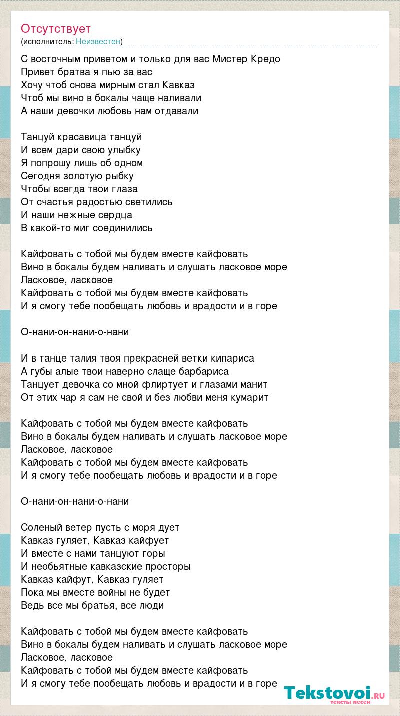 С восточным приветом и только для вас Мистер Кредо Привет братва я пью за вас Хочу чтоб снова мирным стал Кавказ Чтоб мы вино в бокалы чаще наливали А наши девочки любовь нам отдавали Танцуй красавица танцуй И всем дари свою улыбку Я попрошу лишь об одном Сегодня золотую рыбку Чтобы всегда твои глаза От счастья радостью светились И наши нежные сердца В какой-то миг соединились Кайфовать с тобой мы будем вместе кайфовать Вино в бокалы будем наливать и слушать ласковое море Ласковое, ласковое Кайфовать с тобой мы будем вместе кайфовать И я смогу тебе пообещать любовь и врадости и в горе О-нани-он-нани-о-нани И в танце талия твоя прекрасней ветки кипариса А губы алые твои наверно слаще барбариса Танцует девочка со мной флиртует и глазами манит От этих чар я сам не свой и без любви меня кумарит Кайфовать с тобой мы будем вместе кайфовать Вино в бокалы будем наливать и слушать ласковое море Ласковое, ласковое Кайфовать с тобой мы будем вместе кайфовать И я смогу тебе пообещать любовь и врадости и в горе О-нани-он-нани-о-нани Соленый ветер пусть с моря дует Кавказ гуляет, Кавказ кайфует И вместе с нами танцуют горы И необьятные кавказские просторы Кавказ кайфут, Кавказ гуляет Пока мы вместе войны не будет Ведь все мы братья, все люди Кайфовать с тобой мы будем вместе кайфовать Вино в бокалы будем наливать и слушать ласковое море Ласковое, ласковое Кайфовать с тобой мы будем вместе кайфовать И я смогу тебе пообещать любовь и врадости и в горе