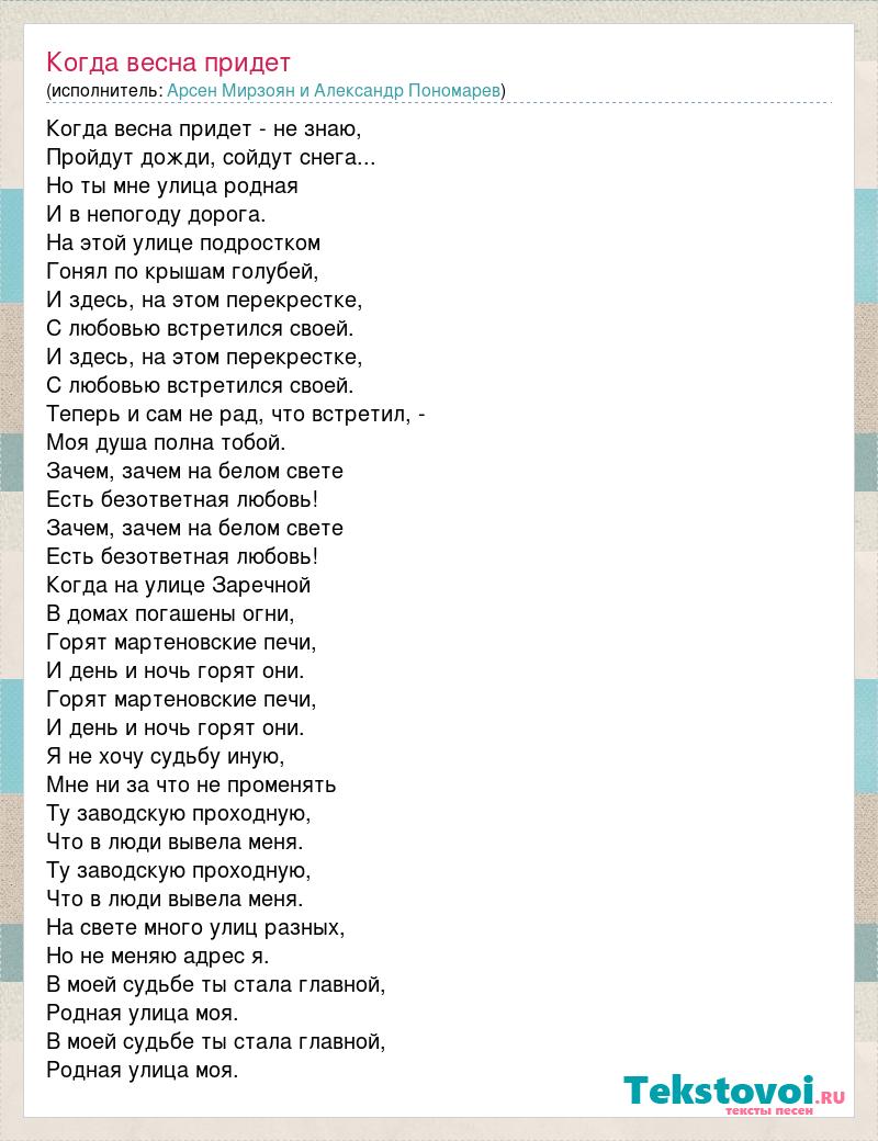 Когда весна придет - не знаю, Пройдут дожди, сойдут снега... Но ты мне улица родная И в непогоду дорога. На этой улице подростком Гонял по крышам голубей, И здесь, на этом перекрестке, С любовью встретился своей. И здесь, на этом перекрестке, С любовью встретился своей. Теперь и сам не рад, что встретил, - Моя душа полна тобой. Зачем, зачем на белом свете Есть безответная любовь! Зачем, зачем на белом свете Есть безответная любовь! Когда на улице Заречной В домах погашены огни, Горят мартеновские печи, И день и ночь горят они. Горят мартеновские печи, И день и ночь горят они. Я не хочу судьбу иную, Мне ни за что не променять Ту заводскую проходную, Что в люди вывела меня. Ту заводскую проходную, Что в люди вывела меня. На свете много улиц разных, Но не меняю адрес я. В моей судьбе ты стала главной, Родная улица моя. В моей судьбе ты стала главной, Родная улица моя.