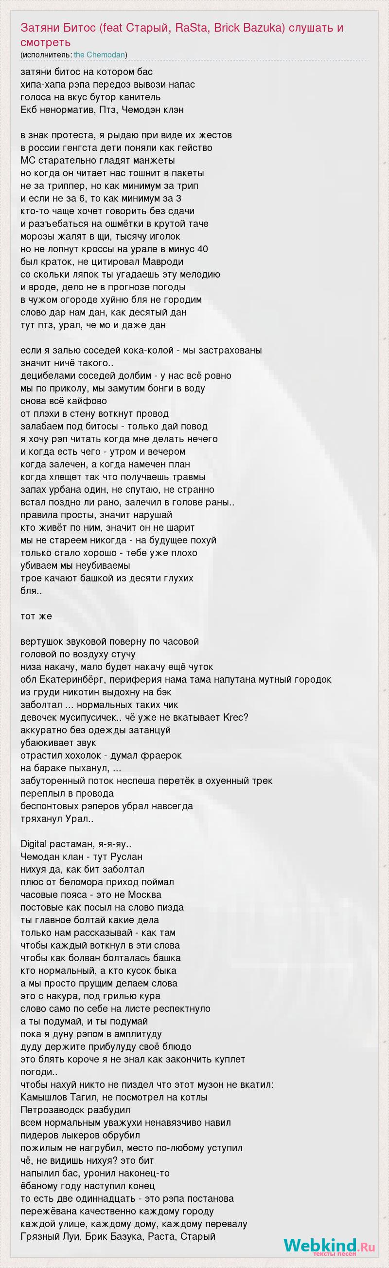 затяни битос на котором бас хипа-хапа рэпа передоз вывози напас голоса на вкус бутор канитель Екб ненорматив, Птз, Чемодэн клэн в знак протеста, я рыдаю при виде их жестов в россии генгста дети поняли как гейство МС старательно гладят манжеты но когда он читает нас тошнит в пакеты не за триппер, но как минимум за трип и если не за 6, то как минимум за 3 кто-то чаще хочет говорить без сдачи и разъебаться на ошмётки в крутой таче морозы жалят в щи, тысячу иголок но не лопнут кроссы на урале в минус 40 был краток, не цитировал Мавроди со скольки ляпок ты угадаешь эту мелодию и вроде, дело не в прогнозе погоды в чужом огороде хуйню бля не городим слово дар нам дан, как десятый дан тут птз, урал, че мо и даже дан если я залью соседей кока-колой - мы застрахованы значит ничё такого.. децибелами соседей долбим - у нас всё ровно мы по приколу, мы замутим бонги в воду снова всё кайфово от плэхи в стену воткнут провод залабаем под битосы - только дай повод я хочу рэп читать когда мне делать нечего и когда есть чего - утром и вечером когда залечен, а когда намечен план когда хлещет так что получаешь травмы запах урбана один, не спутаю, не странно встал поздно ли рано, залечил в голове раны.. правила просты, значит нарушай кто живёт по ним, значит он не шарит мы не стареем никогда - на будущее похуй только стало хорошо - тебе уже плохо убиваем мы неубиваемы трое качают башкой из десяти глухих бля.. тот же вертушок звуковой поверну по часовой головой по воздуху стучу низа накачу, мало будет накачу ещё чуток обл Екатеринбёрг, периферия нама тама напутана мутный городок из груди никотин выдохну на бэк заболтал ... нормальных таких чик девочек мусипусичек.. чё уже не вкатывает Krec? аккуратно без одежды затанцуй убаюкивает звук отрастил хохолок - думал фраерок на бараке пыханул, ... забуторенный поток неспеша перетёк в охуенный трек переплыл в провода беспонтовых рэперов убрал навсегда тряханул Урал.. Digital растаман, я-я-яу.. Чемодан клан - тут Руслан нихуя да, как бит заболтал плюс от беломора приход поймал часовые пояса - это не Москва постовые как посыл на слово пизда ты главное болтай какие дела только нам рассказывай - как там чтобы каждый воткнул в эти слова чтобы как болван болталась башка кто нормальный, а кто кусок быка а мы просто прущим делаем слова это с накура, под грилью кура слово само по себе на листе респектнуло а ты подумай, и ты подумай пока я дуну рэпом в амплитуду дуду держите прибулуду своё блюдо это блять короче я не знал как закончить куплет погоди.. чтобы нахуй никто не пиздел что этот музон не вкатил: Камышлов Тагил, не посмотрел на котлы Петрозаводск разбудил всем нормальным уважухи ненавязчиво навил пидеров лыкеров обрубил пожилым не нагрубил, место по-любому уступил чё, не видишь нихуя? это бит напылил бас, уронил наконец-то ёбаному году наступил конец то есть две одиннадцать - это рэпа постанова пережёвана качественно каждому городу каждой улице, каждому дому, каждому перевалу Грязный Луи, Брик Базука, Раста, Старый