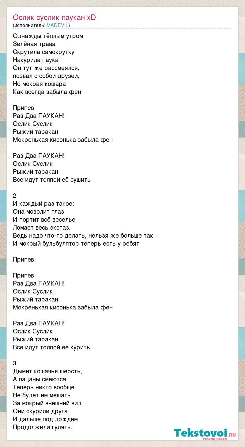 Однажды тёплым утром Зелёная трава Скрутила самокрутку Накурила паука Он тут же рассмеялся, позвал с собой друзей, Но мокрая кошара Как всегда забыла фен Припев Раз Два ПАУКАН! Ослик Суслик Рыжий таракан Мокренькая кисонька забыла фен Раз Два ПАУКАН! Ослик Суслик Рыжий таракан Все идут толпой её сушить 2 И каждый раз такое: Она мозолит глаз И портит всё веселье Ломает весь экстаз. Ведь надо что-то делать, нельзя же больше так И мокрый бульбулятор теперь есть у ребят Припев Припев Раз Два ПАУКАН! Ослик Суслик Рыжий таракан Мокренькая кисонька забыла фен Раз Два ПАУКАН! Ослик Суслик Рыжий таракан Все идут толпой её курить 3 Дымит кошачья шерсть, А пацаны смеются Теперь никто вообще Не будет им мешать За мокрый внешний вид Они скурили друга И дальше под дождём Продолжили гулять.