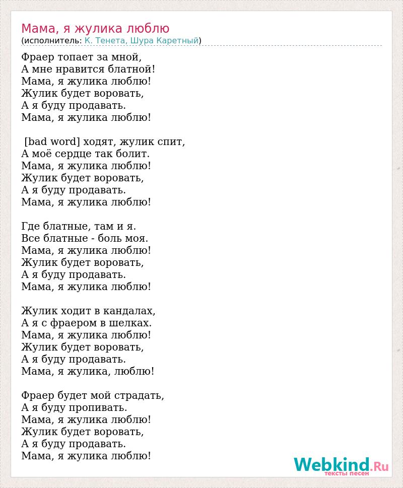 Фраер топает за мной, А мне нравится блатной! Мама, я жулика люблю! Жулик будет воровать, А я буду продавать. Мама, я жулика люблю! [bad word] ходят, жулик спит, А моё сердце так болит. Мама, я жулика люблю! Жулик будет воровать, А я буду продавать. Мама, я жулика люблю! Где блатные, там и я. Все блатные - боль моя. Мама, я жулика люблю! Жулик будет воровать, А я буду продавать. Мама, я жулика люблю! Жулик ходит в кандалах, А я с фраером в шелках. Мама, я жулика люблю! Жулик будет воровать, А я буду продавать. Мама, я жулика, люблю! Фраер будет мой страдать, А я буду пропивать. Мама, я жулика люблю! Жулик будет воровать, А я буду продавать. Мама, я жулика люблю!