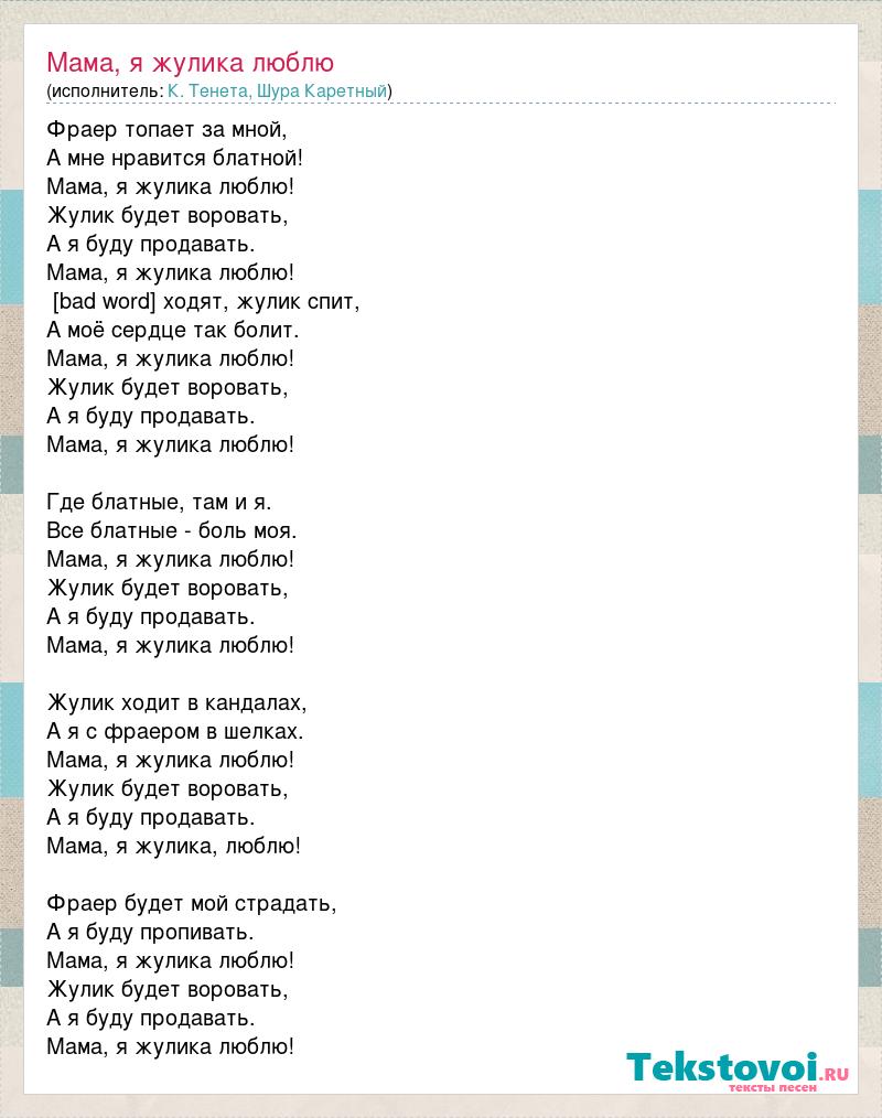 Фраер топает за мной, А мне нравится блатной! Мама, я жулика люблю! Жулик будет воровать, А я буду продавать. Мама, я жулика люблю! [bad word] ходят, жулик спит, А моё сердце так болит. Мама, я жулика люблю! Жулик будет воровать, А я буду продавать. Мама, я жулика люблю! Где блатные, там и я. Все блатные - боль моя. Мама, я жулика люблю! Жулик будет воровать, А я буду продавать. Мама, я жулика люблю! Жулик ходит в кандалах, А я с фраером в шелках. Мама, я жулика люблю! Жулик будет воровать, А я буду продавать. Мама, я жулика, люблю! Фраер будет мой страдать, А я буду пропивать. Мама, я жулика люблю! Жулик будет воровать, А я буду продавать. Мама, я жулика люблю!