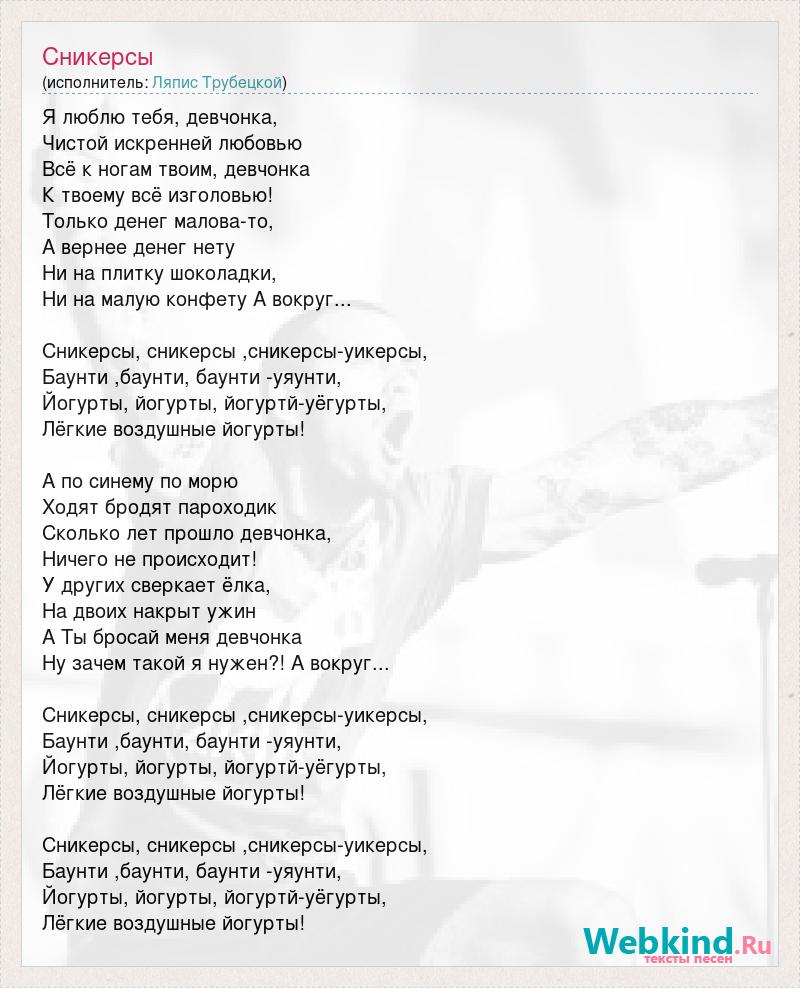 Я люблю тебя, девчонка, Чистой искренней любовью Всё к ногам твоим, девчонка К твоему всё изголовью! Только денег малова-то, А вернее денег нету Ни на плитку шоколадки, Ни на малую конфету А вокруг... Сникерсы, сникерсы ,сникерсы-уикерсы, Баунти ,баунти, баунти -уяунти, Йогурты, йогурты, йогуртй-уёгурты, Лёгкие воздушные йогурты! А по синему по морю Ходят бродят пароходик Сколько лет прошло девчонка, Ничего не происходит! У других сверкает ёлка, На двоих накрыт ужин А Ты бросай меня девчонка Ну зачем такой я нужен?! А вокруг... Сникерсы, сникерсы ,сникерсы-уикерсы, Баунти ,баунти, баунти -уяунти, Йогурты, йогурты, йогуртй-уёгурты, Лёгкие воздушные йогурты! Сникерсы, сникерсы ,сникерсы-уикерсы, Баунти ,баунти, баунти -уяунти, Йогурты, йогурты, йогуртй-уёгурты, Лёгкие воздушные йогурты!