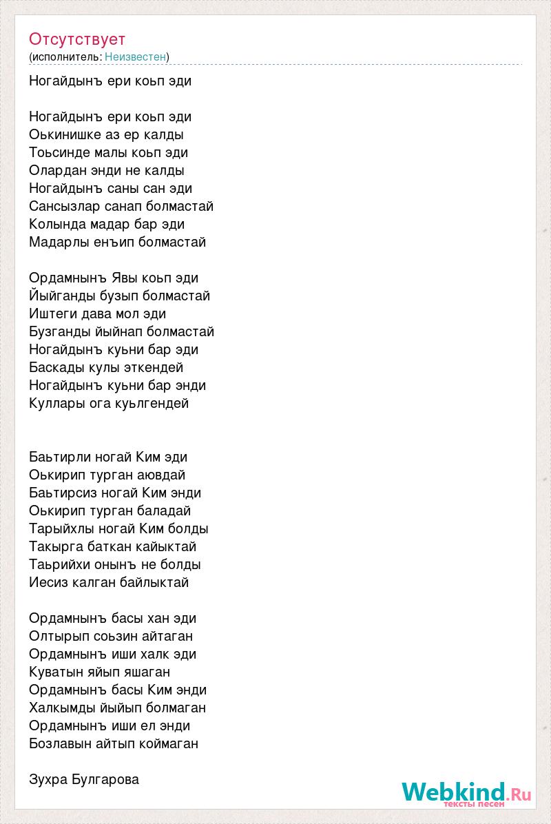 Ногайдынъ ери коьп эди Ногайдынъ ери коьп эди Оькинишке аз ер калды Тоьсинде малы коьп эди Олардан энди не калды Ногайдынъ саны сан эди Сансызлар санап болмастай Колында мадар бар эди Мадарлы енъип болмастай Ордамнынъ Явы коьп эди Йыйганды бузып болмастай Иштеги дава мол эди Бузганды йыйнап болмастай Ногайдынъ куьни бар эди Баскады кулы эткендей Ногайдынъ куьни бар энди Куллары ога куьлгендей Баьтирли ногай Ким эди Оькирип турган аювдай Баьтирсиз ногай Ким энди Оькирип турган баладай Тарыйхлы ногай Ким болды Такырга баткан кайыктай Таьрийхи онынъ не болды Иесиз калган байлыктай Ордамнынъ басы хан эди Олтырып соьзин айтаган Ордамнынъ иши халк эди Куватын яйып яшаган Ордамнынъ басы Ким энди Халкымды йыйып болмаган Ордамнынъ иши ел энди Бозлавын айтып коймаган Зухра Булгарова