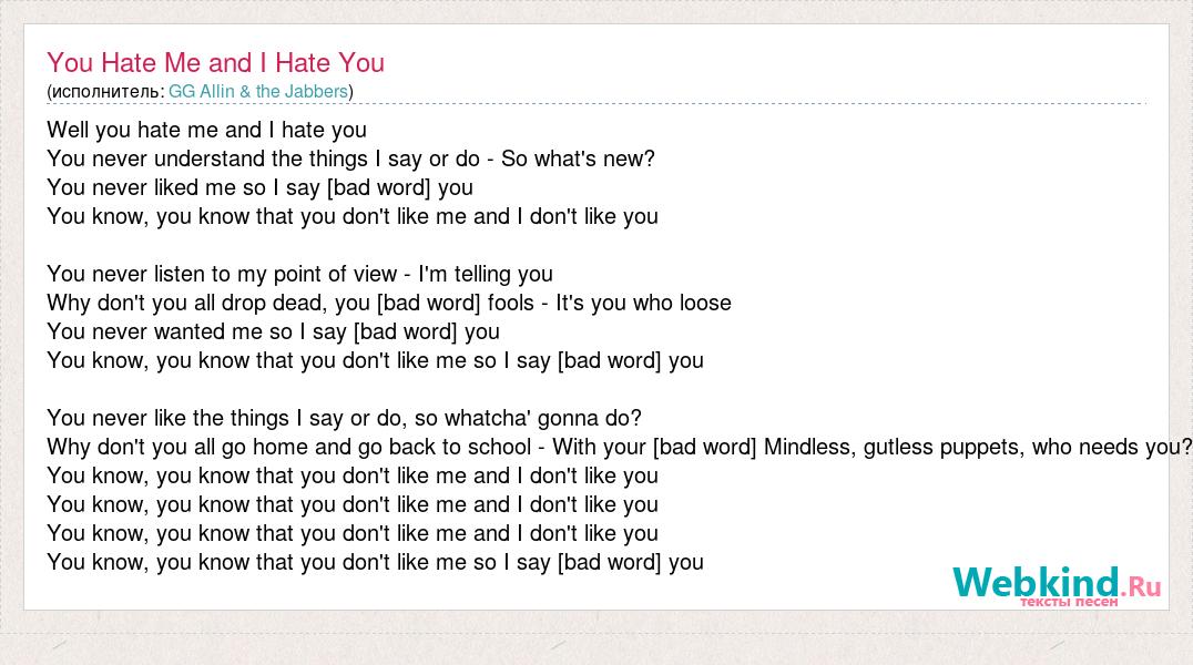 Well you hate me and I hate you You never understand the things I say or do - So what's new? You never liked me so I say [bad word] you You know, you know that you don't like me and I don't like you You never listen to my point of view - I'm telling you Why don't you all drop dead, you [bad word] fools - It's you who loose You never wanted me so I say [bad word] you You know, you know that you don't like me so I say [bad word] you You never like the things I say or do, so whatcha' gonna do? Why don't you all go home and go back to school - With your [bad word] Mindless, gutless puppets, who needs you? You know, you know that you don't like me and I don't like you You know, you know that you don't like me and I don't like you You know, you know that you don't like me and I don't like you You know, you know that you don't like me so I say [bad word] you