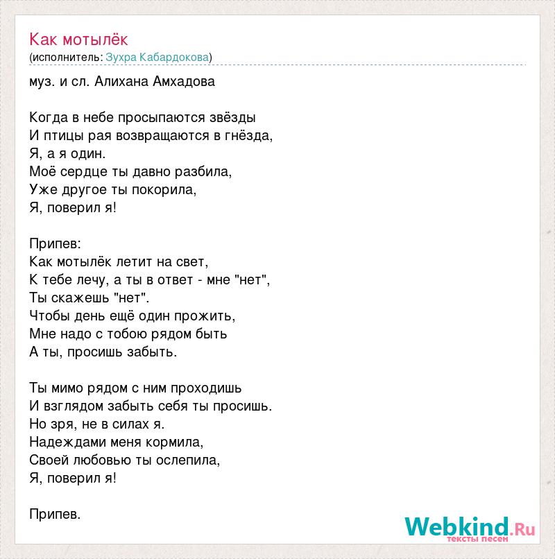 муз. и сл. Алихана Амхадова Когда в небе просыпаются звёзды И птицы рая возвращаются в гнёзда, Я, а я один. Моё сердце ты давно разбила, Уже другое ты покорила, Я, поверил я! Припев: Как мотылёк летит на свет, К тебе лечу, а ты в ответ - мне "нет", Ты скажешь "нет". Чтобы день ещё один прожить, Мне надо с тобою рядом быть А ты, просишь забыть. Ты мимо рядом с ним проходишь И взглядом забыть себя ты просишь. Но зря, не в силах я. Надеждами меня кормила, Своей любовью ты ослепила, Я, поверил я! Припев.