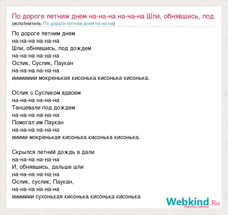 По дороге летним днем на-на-на на-на-на Шли, обнявшись, под дождем на-на-на на-на-на Ослик, Суслик, Паукан на-на-на на-на-на ииииииии мокренькая кисонька кисонька кисонька. Ослик с Сусликом вдвоем на-на-на на-на-на Танцевали под дождем. на-на-на на-на-на Помогал им Паукан на-на-на на-на-на иииии мокренькая кисонька кисонька кисонька. Скрылся летний дождь в дали на-на-на на-на-на И, обнявшись, дальше шли на-на-на на-на-на Ослик, суслик, Паукан, на-на-на на-на-на иииииии сухонькая кисонька кисонька кисонька