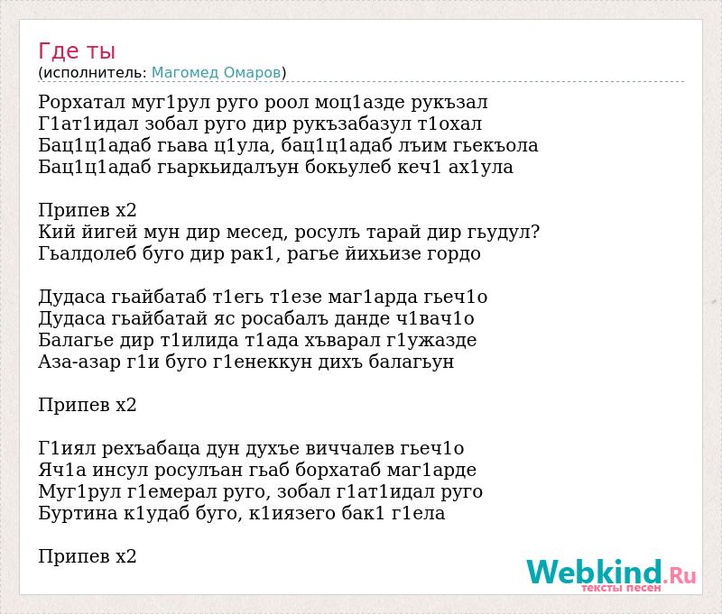 Рорхатал муг1рул руго роол моц1азде рукъзал Г1ат1идал зобал руго дир рукъзабазул т1охал Бац1ц1адаб гьава ц1ула, бац1ц1адаб лъим гьекъола Бац1ц1адаб гьаркьидалъун бокьулеб кеч1 ах1ула Припев х2 Кий йигей мун дир месед, росулъ тарай дир гьудул? Гьалдолеб буго дир рак1, рагье йихьизе гордо Дудаса гьайбатаб т1егь т1езе маг1арда гьеч1о Дудаса гьайбатай яс росабалъ данде ч1вач1о Балагье дир т1илида т1ада хъварал г1ужазде Аза-азар г1и буго г1енеккун дихъ балагьун Припев х2 Г1иял рехъабаца дун духъе виччалев гьеч1о Яч1а инсул росулъан гьаб борхатаб маг1арде Муг1рул г1емерал руго, зобал г1ат1идал руго Буртина к1удаб буго, к1иязего бак1 г1ела Припев х2