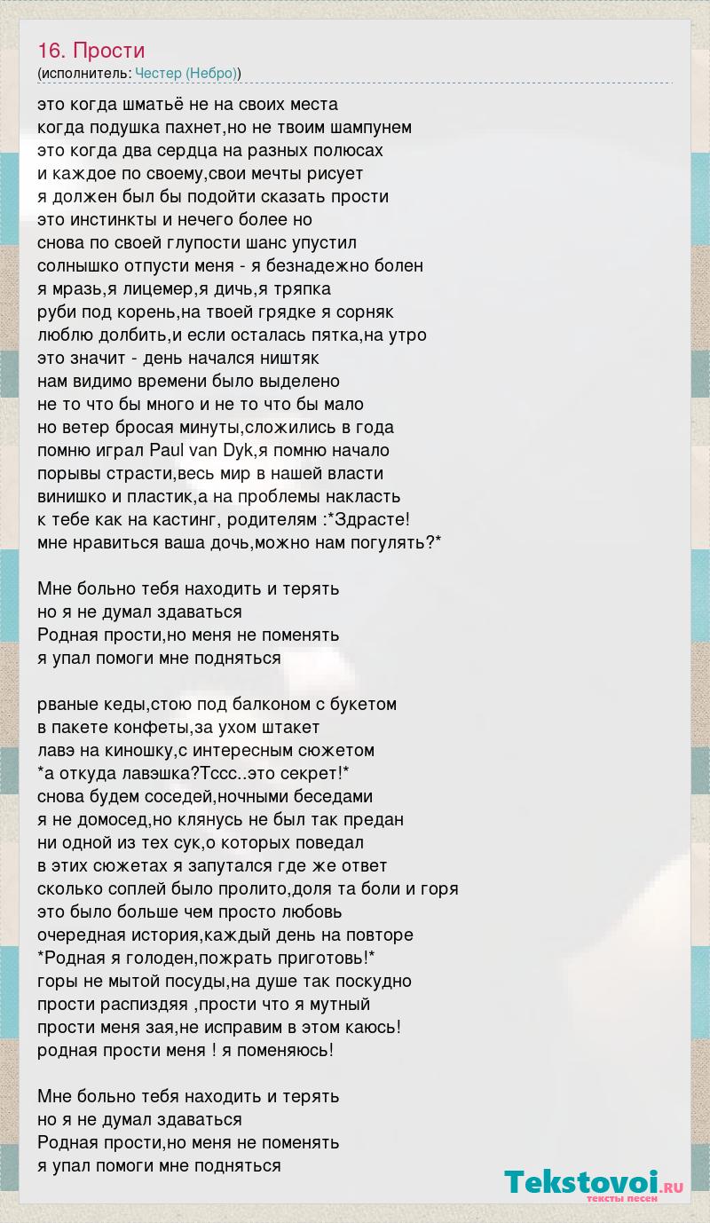 это когда шматьё не на своих места когда подушка пахнет,но не твоим шампунем это когда два сердца на разных полюсах и каждое по своему,свои мечты рисует я должен был бы подойти сказать прости это инстинкты и нечего более но снова по своей глупости шанс упустил солнышко отпусти меня - я безнадежно болен я мразь,я лицемер,я дичь,я тряпка руби под корень,на твоей грядке я сорняк люблю долбить,и если осталась пятка,на утро это значит - день начался ништяк нам видимо времени было выделено не то что бы много и не то что бы мало но ветер бросая минуты,сложились в года помню играл Paul van Dyk,я помню начало порывы страсти,весь мир в нашей власти винишко и пластик,а на проблемы накласть к тебе как на кастинг, родителям :*Здрасте! мне нравиться ваша дочь,можно нам погулять?* Мне больно тебя находить и терять но я не думал здаваться Родная прости,но меня не поменять я упал помоги мне подняться рваные кеды,стою под балконом с букетом в пакете конфеты,за ухом штакет лавэ на киношку,с интересным сюжетом *а откуда лавэшка?Тссс..это секрет!* снова будем соседей,ночными беседами я не домосед,но клянусь не был так предан ни одной из тех сук,о которых поведал в этих сюжетах я запутался где же ответ сколько соплей было пролито,доля та боли и горя это было больше чем просто любовь очередная история,каждый день на повторе *Родная я голоден,пожрать приготовь!* горы не мытой посуды,на душе так поскудно прости распиздяя ,прости что я мутный прости меня зая,не исправим в этом каюсь! родная прости меня ! я поменяюсь! Мне больно тебя находить и терять но я не думал здаваться Родная прости,но меня не поменять я упал помоги мне подняться
