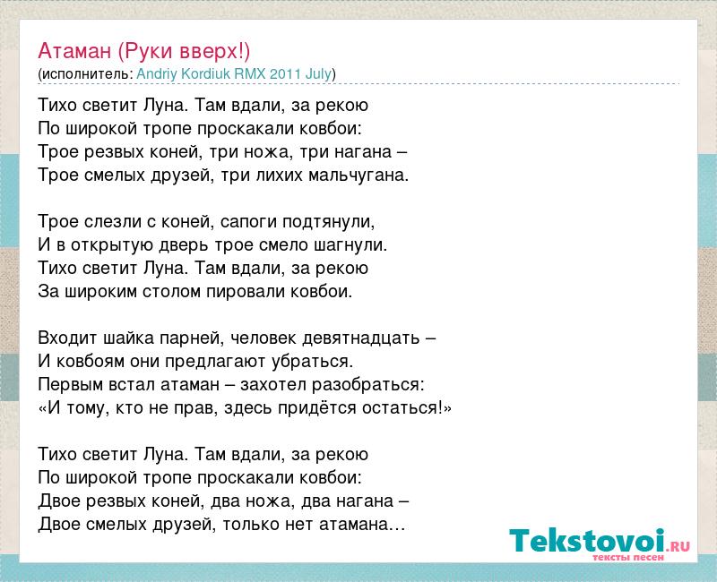 Тихо светит Луна. Там вдали, за рекою По широкой тропе проскакали ковбои: Трое резвых коней, три ножа, три нагана – Трое смелых друзей, три лихих мальчугана. Трое слезли с коней, сапоги подтянули, И в открытую дверь трое смело шагнули. Тихо светит Луна. Там вдали, за рекою За широким столом пировали ковбои. Входит шайка парней, человек девятнадцать – И ковбоям они предлагают убраться. Первым встал атаман – захотел разобраться: «И тому, кто не прав, здесь придётся остаться!» Тихо светит Луна. Там вдали, за рекою По широкой тропе проскакали ковбои: Двое резвых коней, два ножа, два нагана – Двое смелых друзей, только нет атамана…