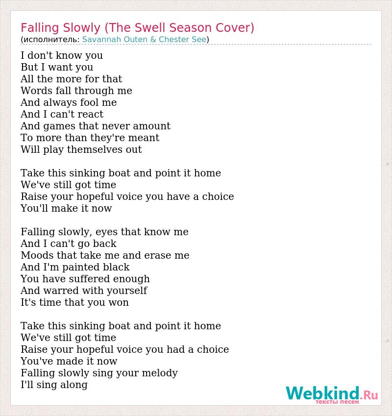 I don't know you But I want you All the more for that Words fall through me And always fool me And I can't react And games that never amount To more than they're meant Will play themselves out Take this sinking boat and point it home We've still got time Raise your hopeful voice you have a choice You'll make it now Falling slowly, eyes that know me And I can't go back Moods that take me and erase me And I'm painted black You have suffered enough And warred with yourself It's time that you won Take this sinking boat and point it home We've still got time Raise your hopeful voice you had a choice You've made it now Falling slowly sing your melody I'll sing along