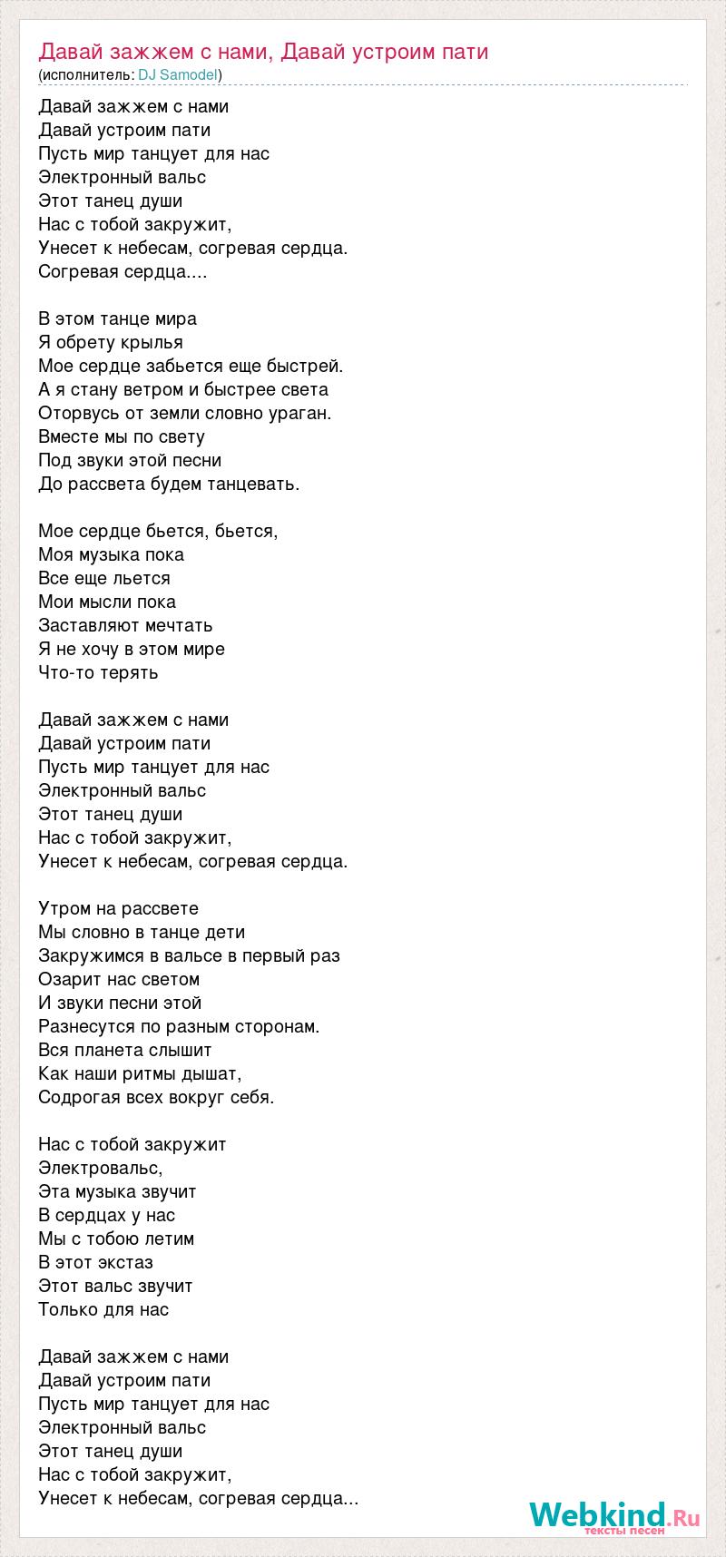 Давай зажжем с нами Давай устроим пати Пусть мир танцует для нас Электронный вальс Этот танец души Нас с тобой закружит, Унесет к небесам, согревая сердца. Согревая сердца.... В этом танце мира Я обрету крылья Мое сердце забьется еще быстрей. А я стану ветром и быстрее света Оторвусь от земли словно ураган. Вместе мы по свету Под звуки этой песни До рассвета будем танцевать. Мое сердце бьется, бьется, Моя музыка пока Все еще льется Мои мысли пока Заставляют мечтать Я не хочу в этом мире Что-то терять Давай зажжем с нами Давай устроим пати Пусть мир танцует для нас Электронный вальс Этот танец души Нас с тобой закружит, Унесет к небесам, согревая сердца. Утром на рассвете Мы словно в танце дети Закружимся в вальсе в первый раз Озарит нас светом И звуки песни этой Разнесутся по разным сторонам. Вся планета слышит Как наши ритмы дышат, Содрогая всех вокруг себя. Нас с тобой закружит Электровальс, Эта музыка звучит В сердцах у нас Мы с тобою летим В этот экстаз Этот вальс звучит Только для нас Давай зажжем с нами Давай устроим пати Пусть мир танцует для нас Электронный вальс Этот танец души Нас с тобой закружит, Унесет к небесам, согревая сердца...