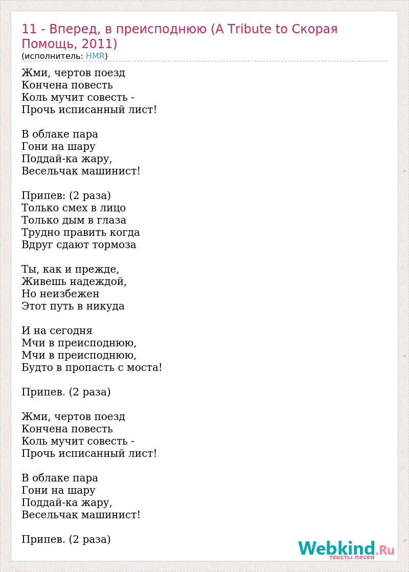 Жми, чертов поезд Кончена повесть Коль мучит совесть - Прочь исписанный лист! В облаке пара Гони на шару Поддай-ка жару, Весельчак машинист! Припев: (2 раза) Только смех в лицо Только дым в глаза Трудно править когда Вдруг сдают тормоза Ты, как и прежде, Живешь надеждой, Но неизбежен Этот путь в никуда И на сегодня Мчи в преисподнюю, Мчи в преисподнюю, Будто в пропасть с моста! Припев. (2 раза) Жми, чертов поезд Кончена повесть Коль мучит совесть - Прочь исписанный лист! В облаке пара Гони на шару Поддай-ка жару, Весельчак машинист! Припев. (2 раза)