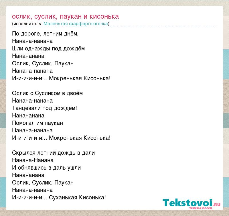 По дороге, летним днём, Нанана-нанана Шли однажды под дождём Нанананана Ослик, Суслик, Паукан Нанана-нанана И-и-и-и-и-и... Мокренькая Кисонька! Ослик с Сусликом в двоём Нанана-нанана Танцевали под дождём! Нанананана Помогал им паукан Нанана-нанана И-и-и-и-и-и... Мокренькая Кисонька! Скрылся летний дождь в дали Нанана-Нанана И обнявшись в даль ушли Нанананана Ослик, Суслик, Паукан Нанана-нанана И-и-и-и-и-и... Суханькая Кисонька!