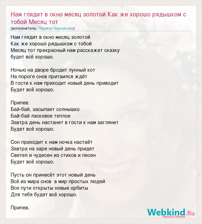 Нам глядит в окно месяц золотой Как же хорошо рядышком с тобой Месяц тот прекрасный нам расскажет сказку будет всё хорошо. Ночью на дворе бродит лунный кот На пороге снов притаился ждёт В гости к нам приходит новый день приводит Будет всё хорошо. Припев: Бай-бай, засыпает солнышко Бай-бай ласковое теплое Завтра день настанет в гости к нам заглянет Будет всё хорошо. Сон приходит к нам ночка настаёт Завтра на заре новый день придет Светел и чудесен из стихов и песен Будет всё хорошо. Пусть он принесёт этот новый день Всё из мира снов в мир простых людей Все пути открыты новые орбиты Для тебя будет всё хорошо. Припев.