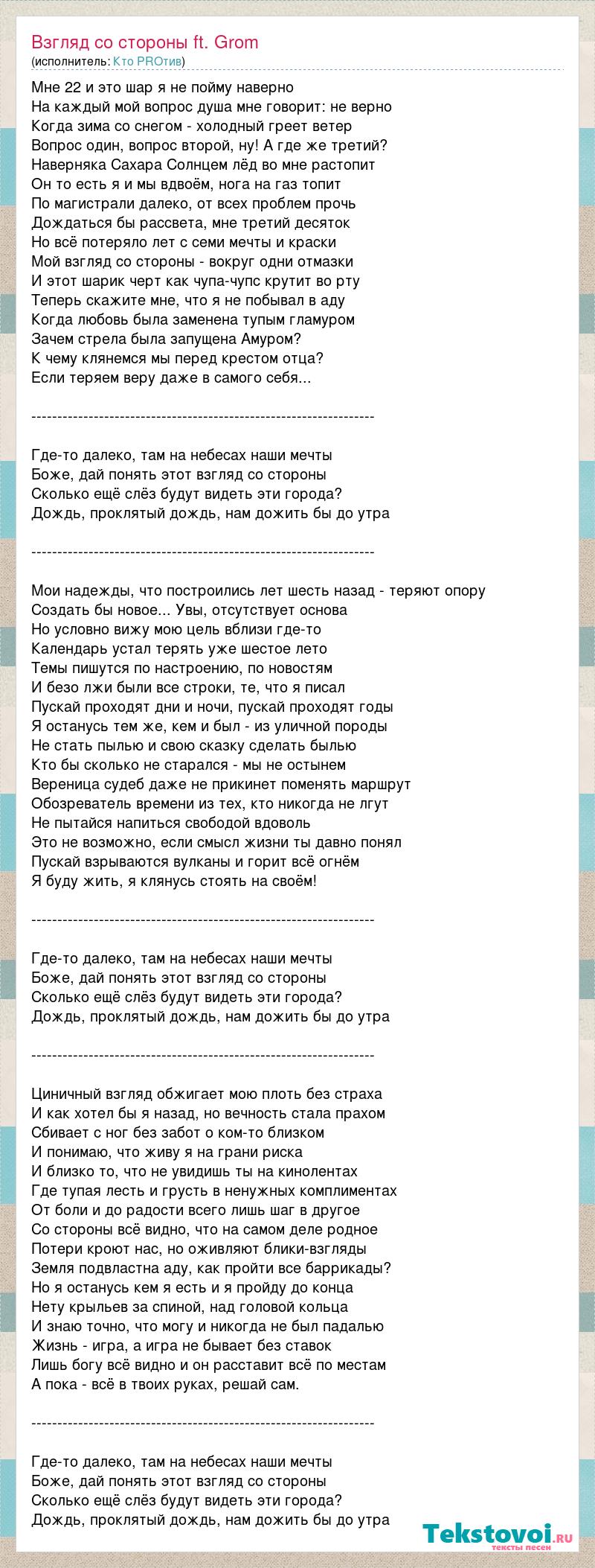 Мне 22 и это шар я не пойму наверно На каждый мой вопрос душа мне говорит: не верно Когда зима со снегом - холодный греет ветер Вопрос один, вопрос второй, ну! А где же третий? Наверняка Сахара Солнцем лёд во мне растопит Он то есть я и мы вдвоём, нога на газ топит По магистрали далеко, от всех проблем прочь Дождаться бы рассвета, мне третий десяток Но всё потеряло лет с семи мечты и краски Мой взгляд со стороны - вокруг одни отмазки И этот шарик черт как чупа-чупс крутит во рту Теперь скажите мне, что я не побывал в аду Когда любовь была заменена тупым гламуром Зачем стрела была запущена Амуром? К чему клянемся мы перед крестом отца? Если теряем веру даже в самого себя... ------------------------------------------------------------------ Где-то далеко, там на небесах наши мечты Боже, дай понять этот взгляд со стороны Сколько ещё слёз будут видеть эти города? Дождь, проклятый дождь, нам дожить бы до утра ------------------------------------------------------------------ Мои надежды, что построились лет шесть назад - теряют опору Создать бы новое... Увы, отсутствует основа Но условно вижу мою цель вблизи где-то Календарь устал терять уже шестое лето Темы пишутся по настроению, по новостям И безо лжи были все строки, те, что я писал Пускай проходят дни и ночи, пускай проходят годы Я останусь тем же, кем и был - из уличной породы Не стать пылью и свою сказку сделать былью Кто бы сколько не старался - мы не остынем Вереница судеб даже не прикинет поменять маршрут Обозреватель времени из тех, кто никогда не лгут Не пытайся напиться свободой вдоволь Это не возможно, если смысл жизни ты давно понял Пускай взрываются вулканы и горит всё огнём Я буду жить, я клянусь стоять на своём! ------------------------------------------------------------------ Где-то далеко, там на небесах наши мечты Боже, дай понять этот взгляд со стороны Сколько ещё слёз будут видеть эти города? Дождь, проклятый дождь, нам дожить бы до утра ------------------------------------------------------------------ Циничный взгляд обжигает мою плоть без страха И как хотел бы я назад, но вечность стала прахом Сбивает с ног без забот о ком-то близком И понимаю, что живу я на грани риска И близко то, что не увидишь ты на кинолентах Где тупая лесть и грусть в ненужных комплиментах От боли и до радости всего лишь шаг в другое Со стороны всё видно, что на самом деле родное Потери кроют нас, но оживляют блики-взгляды Земля подвластна аду, как пройти все баррикады? Но я останусь кем я есть и я пройду до конца Нету крыльев за спиной, над головой кольца И знаю точно, что могу и никогда не был падалью Жизнь - игра, а игра не бывает без ставок Лишь богу всё видно и он расставит всё по местам А пока - всё в твоих руках, решай сам. ------------------------------------------------------------------ Где-то далеко, там на небесах наши мечты Боже, дай понять этот взгляд со стороны Сколько ещё слёз будут видеть эти города? Дождь, проклятый дождь, нам дожить бы до утра