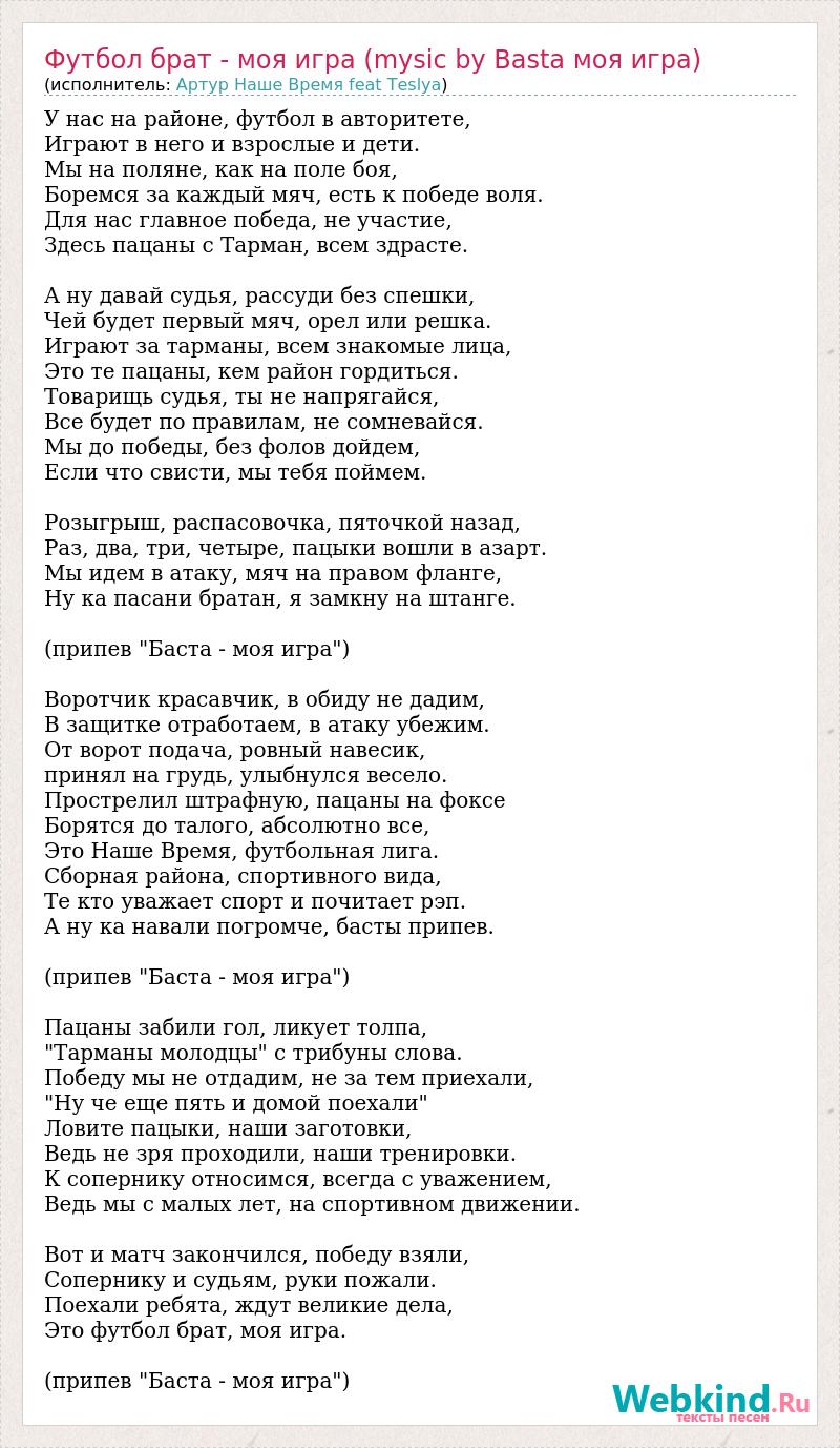 У нас на районе, футбол в авторитете, Играют в него и взрослые и дети. Мы на поляне, как на поле боя, Боремся за каждый мяч, есть к победе воля. Для нас главное победа, не участие, Здесь пацаны с Тарман, всем здрасте. А ну давай судья, рассуди без спешки, Чей будет первый мяч, орел или решка. Играют за тарманы, всем знакомые лица, Это те пацаны, кем район гордиться. Товарищь судья, ты не напрягайся, Все будет по правилам, не сомневайся. Мы до победы, без фолов дойдем, Если что свисти, мы тебя поймем. Розыгрыш, распасовочка, пяточкой назад, Раз, два, три, четыре, пацыки вошли в азарт. Мы идем в атаку, мяч на правом фланге, Ну ка пасани братан, я замкну на штанге. (припев "Баста - моя игра") Воротчик красавчик, в обиду не дадим, В защитке отработаем, в атаку убежим. От ворот подача, ровный навесик, принял на грудь, улыбнулся весело. Прострелил штрафную, пацаны на фоксе Борятся до талого, абсолютно все, Это Наше Время, футбольная лига. Сборная района, спортивного вида, Те кто уважает спорт и почитает рэп. А ну ка навали погромче, басты припев. (припев "Баста - моя игра") Пацаны забили гол, ликует толпа, "Тарманы молодцы" с трибуны слова. Победу мы не отдадим, не за тем приехали, "Ну че еще пять и домой поехали" Ловите пацыки, наши заготовки, Ведь не зря проходили, наши тренировки. К сопернику относимся, всегда с уважением, Ведь мы с малых лет, на спортивном движении. Вот и матч закончился, победу взяли, Сопернику и судьям, руки пожали. Поехали ребята, ждут великие дела, Это футбол брат, моя игра. (припев "Баста - моя игра")